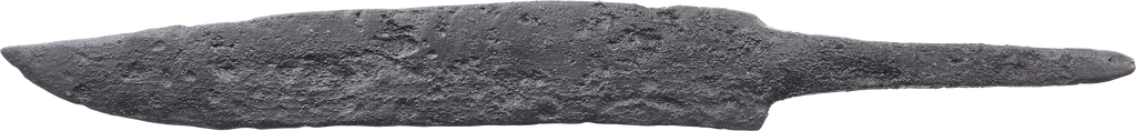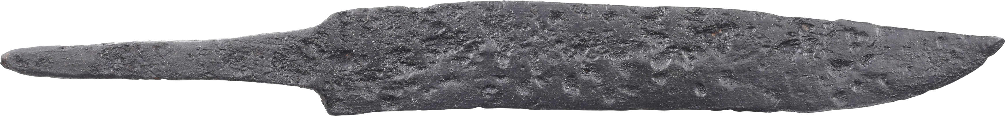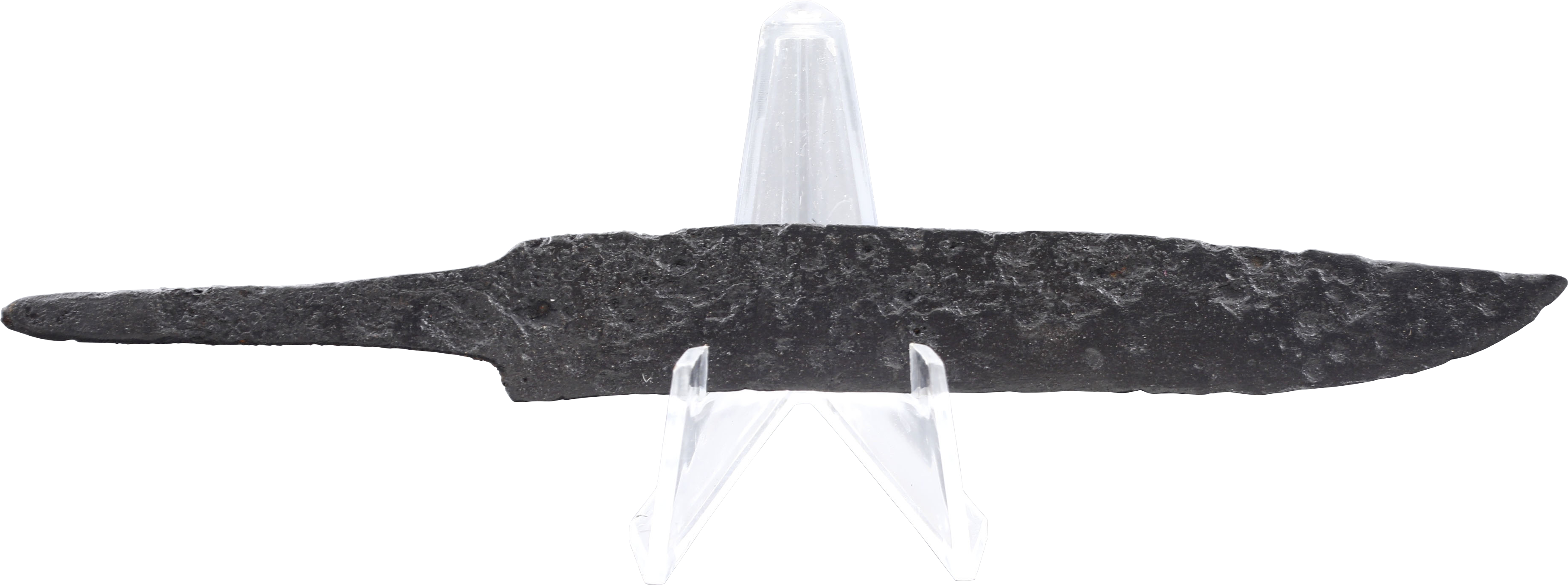 Forged iron, 7 1/8” length. Curved back clipped point blade of thin fighting section, distinguishing it from a work knife. The lack of and sharpening confirms its use as a weapon. Tapered tang for mounting to a bone or antler grip without a guard. Some original surface preserved with burial degradation to the balance. Fine example of the classic Viking scramseax. Professionally conserved with Plexiglas display mount.