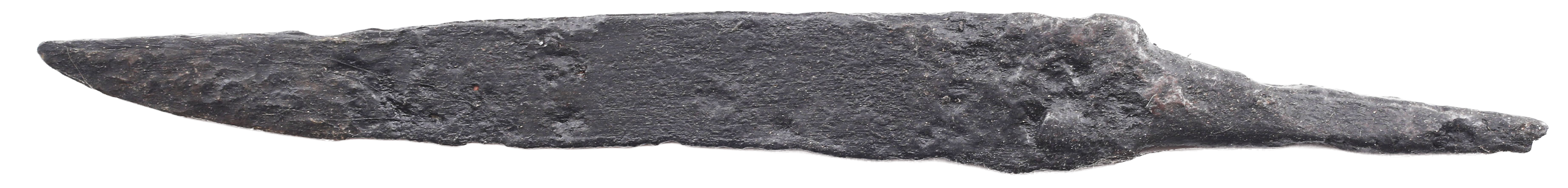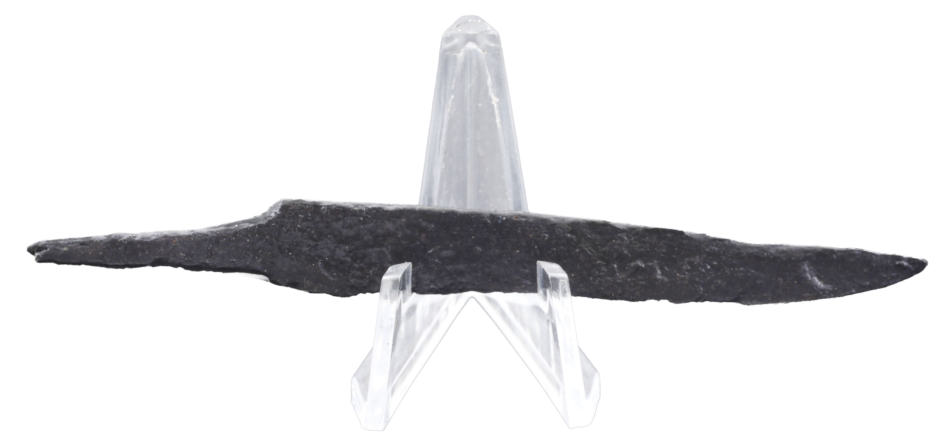 Over 3 5/8” (3.68”) total length. Wedge section blade for slashing with a distinctly dropped point in the scramseax style for thrusting. Whittle tang, to secure it to the wood, bone, or antler grip, now perished. (See Leather Working Reverend and Inhabitat for similar examples with original grips). Stable oxidation with a good profile, as typical for water, finds. These side or pouch knives were among the most treasured possessions for Vikings, rather than the large seax with which they were buried. They likely had spiritual significance to the owner during his life. A fine weapon, suitable for throat slashing as well as organ depth thrusting attacks. Excavated and professionally conserved with Plexiglas display easel and Certificate of Authenticity.