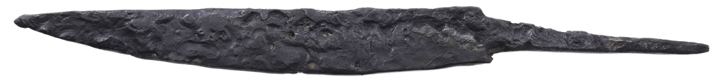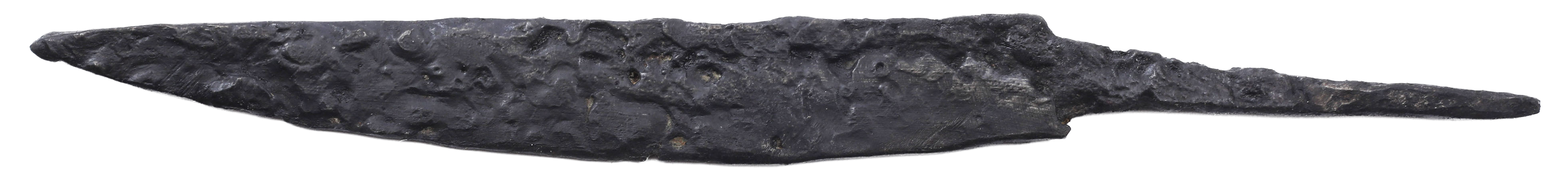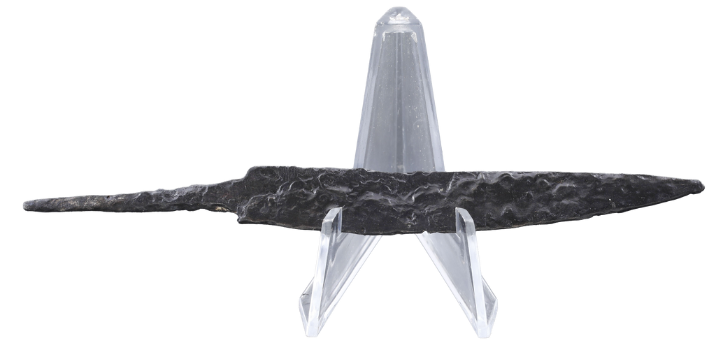 Cambridgeshire England. About 5 1/2” (5.48”) total length. Slender wedge section blade for slashing in the scramseax style for thrusting. Whittle tang, to secure it to the wood, bone, or antler grip, now perished. (See Leather Working Reverend and Inhabitat for similar examples with original grips). Stable oxidation with a good profile, as typical for water, finds. These side or pouch knives were among the most treasured possessions for Vikings, rather than the large seax with which they were buried. They likely had spiritual significance to the owner during his life. A fine weapon, suitable for throat slashing as well as organ depth thrusting attacks. Excavated and professionally conserved with Plexiglas display easel and Certificate of Authenticity. Fine form.