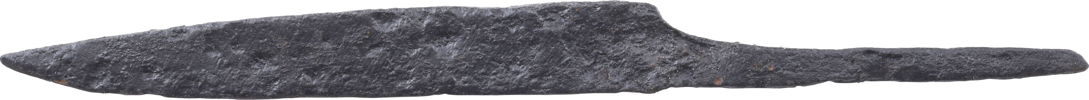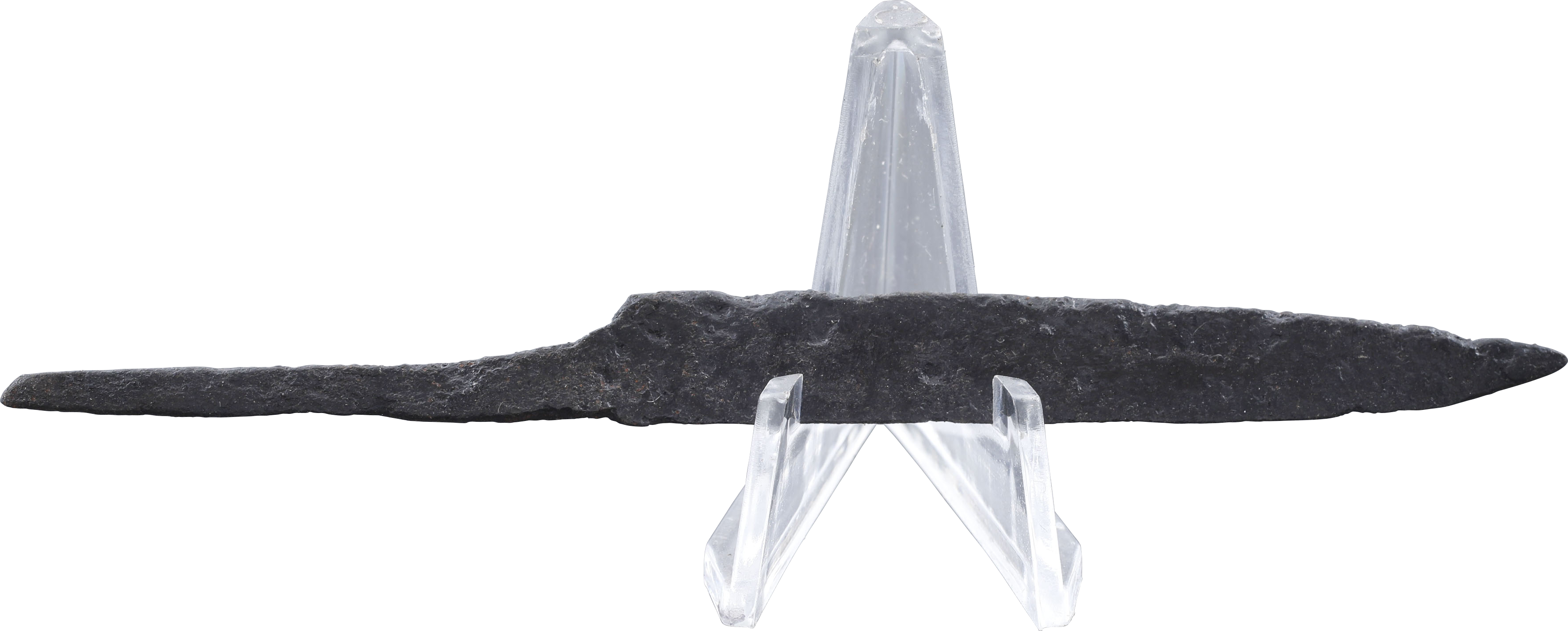 Cambridgeshire, England. Just under 4 1/4” (4.23”) total length with tapered "whittle tang" which identifies these, as they were used without guards, mounted in a wood or antler grip. (Leather Working Reverend and Inhabitat). Blade of wedge section with a straight back, dropping slightly at the point in the scramseax fashion. A slashing weapon, designed for throat-cutting, these were so esteemed by Vikings that it was these, rather than the larger scramseaxes, that were buried with the warriors. Virtually every old town in Cambridgeshire has a recorded Viking history. Ely Abbey was destroyed in 870 by Danish raiders and Huntingdon was a staging place for Danish raids until 917, to mention two. Excavated and professionally conserved with Plexiglas display mount.
