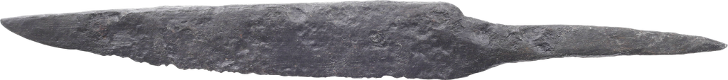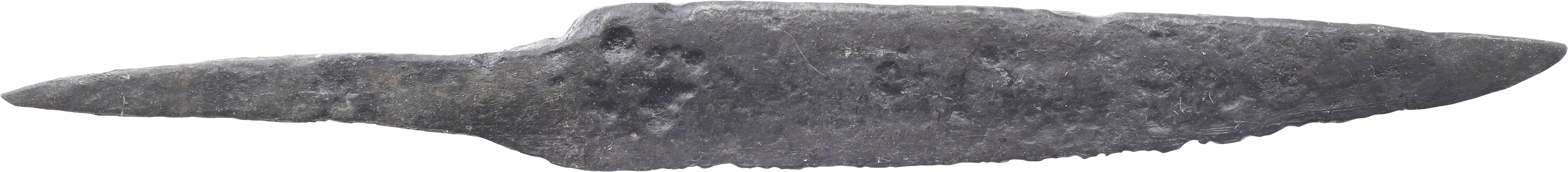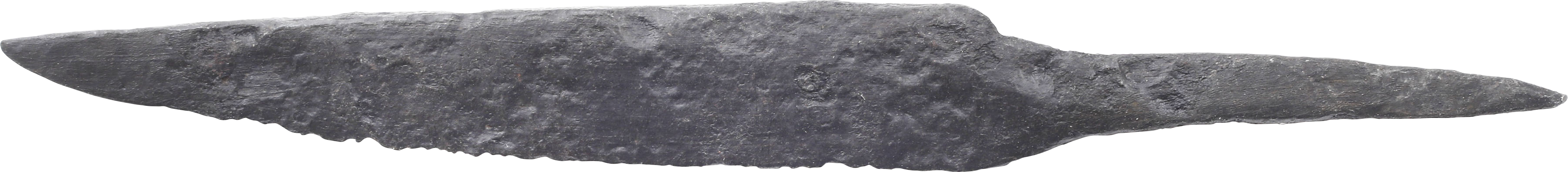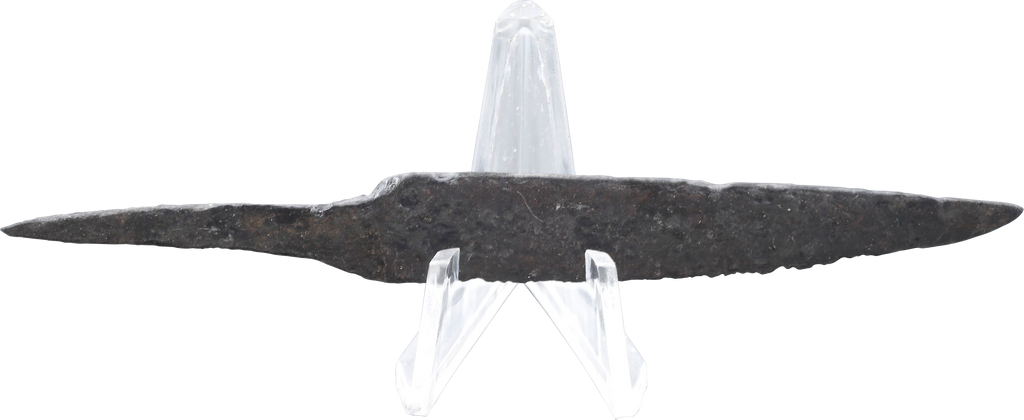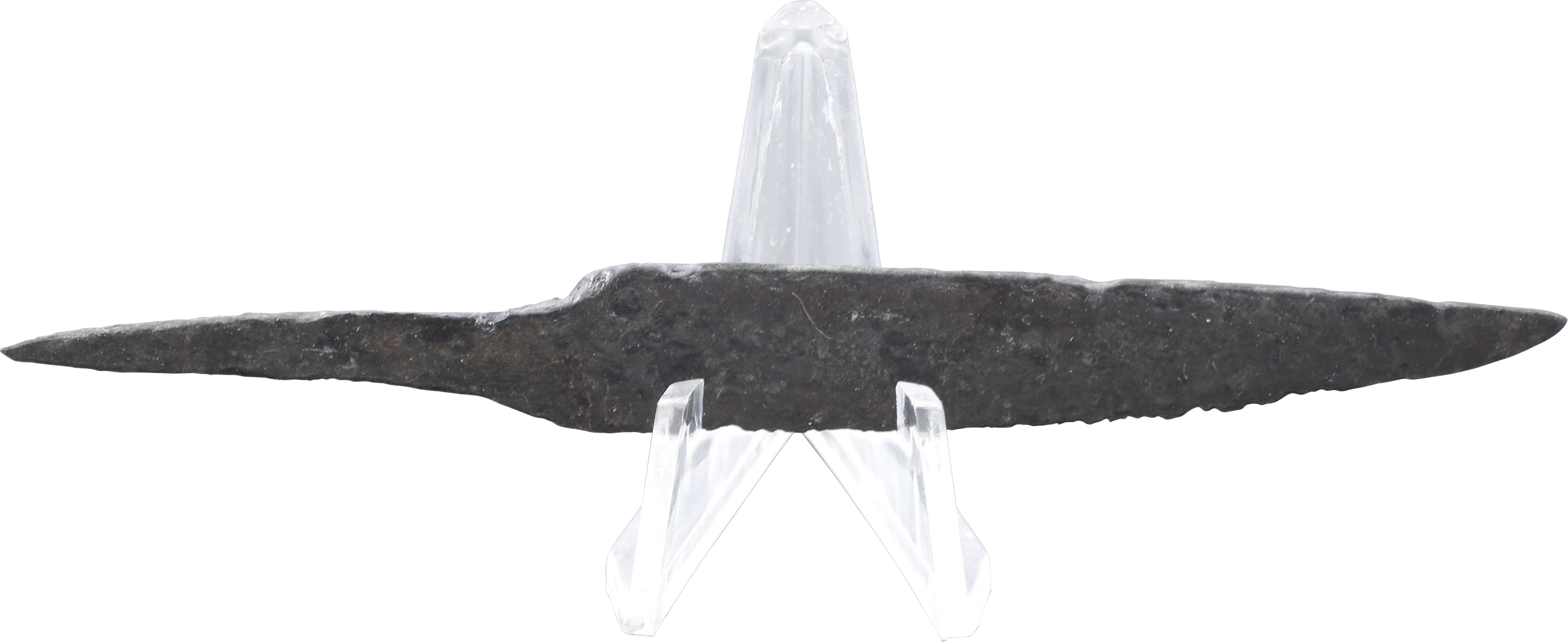 Yorkshire, England. Just over 4 1/8” (4.16”) total length with tapered "whittle tang" which identifies these, as they were used without guards, mounted in a wood or antler grip. (See Leather Working Reverend and Inhabitat for similar examples with original grips). Blade of a particularly thin slashing section with a straight back, curved at the point in the scramseax fashion. A slashing weapon, designed for throat-cutting, these were so esteemed by Vikings that it was these, rather than the larger scramseaxes, that were buried with the warriors. Virtually every old town in Cambridgeshire has a recorded Viking history. Ely Abbey was destroyed in 870 by Danish raiders and Huntingdon was a staging place for Danish raids until 917, to mention two. Excavated and professionally conserved with Plexiglas display mount.