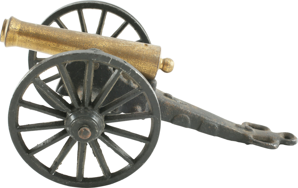 5 3/4" length. Modeled as an early to mid-19th-century artillery field piece with iron carriage and wheels. tapered brass tube with a stepped flared muzzle and cascabel. Non-firing. Charming.