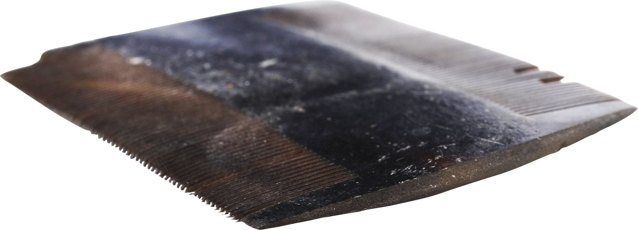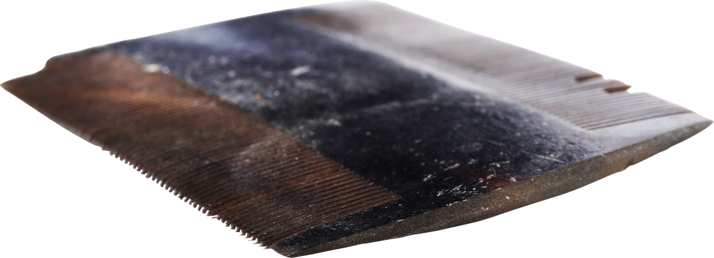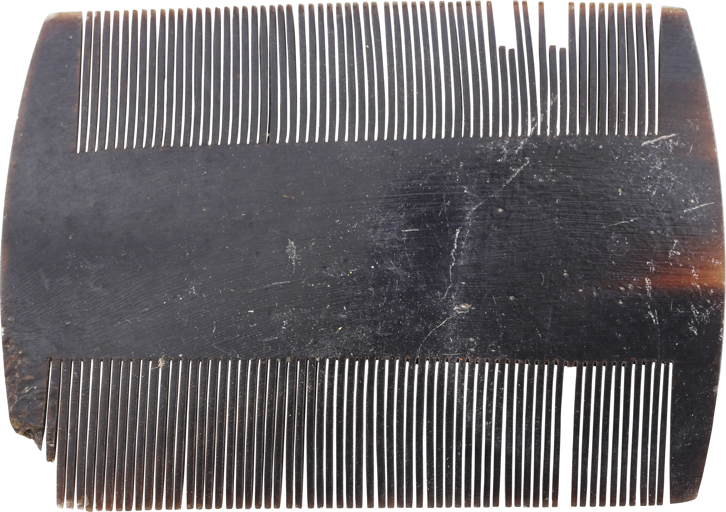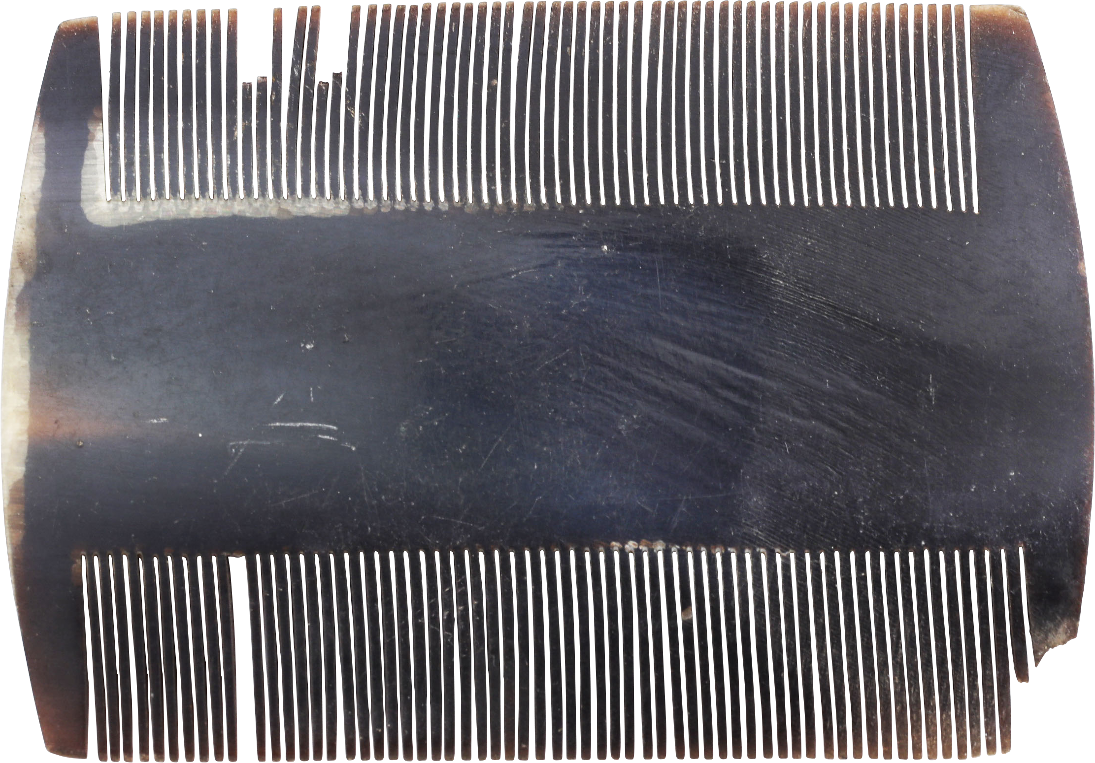 2 3/8” width, made of flattened cow horn with the teeth saw cut. Sold by sutlers and benefitting from their compact size and shape which required minimal space.  Here as with most hair combs through history, the purpose was not grooming, but to remove lice. Small damages as shown.