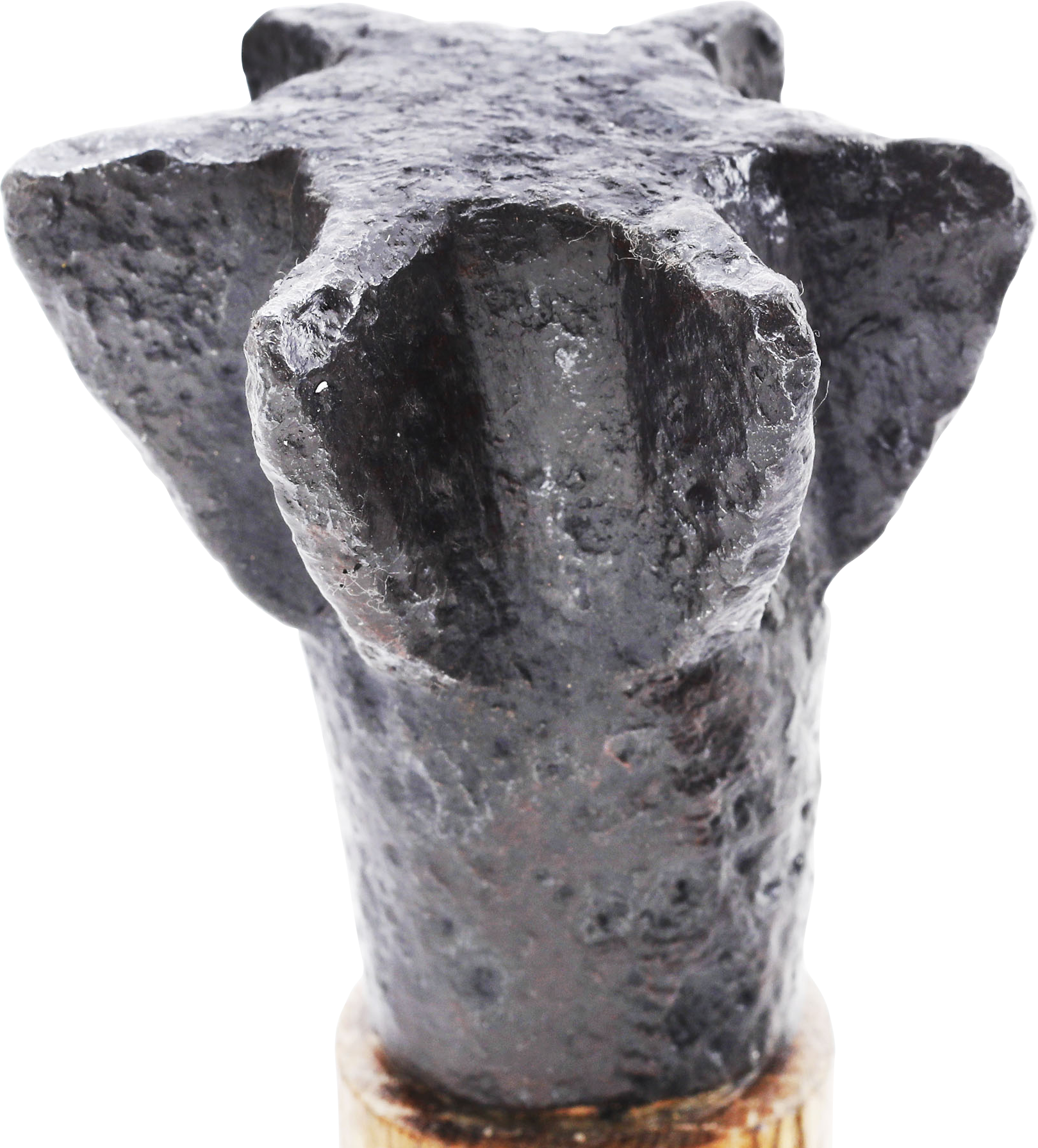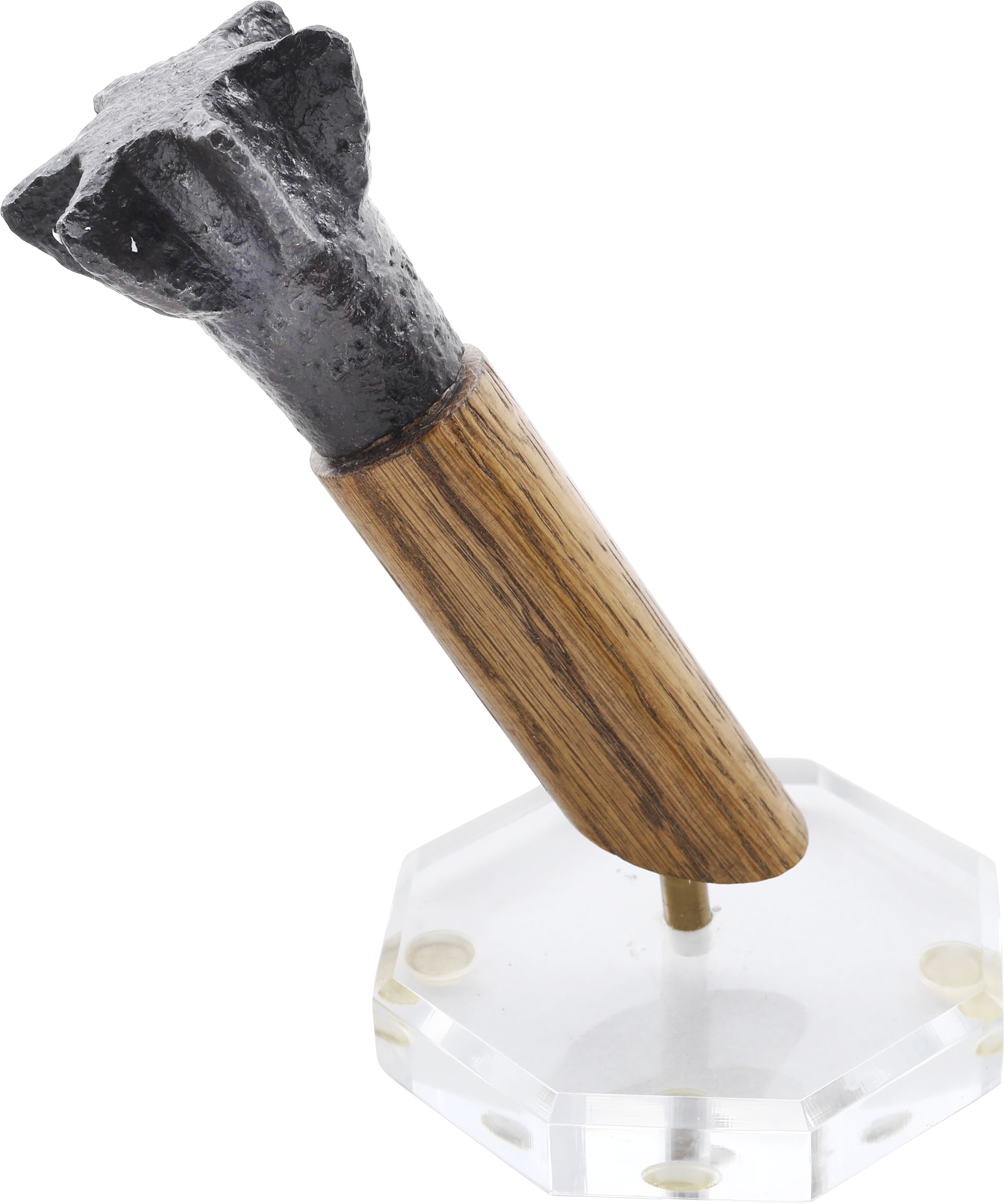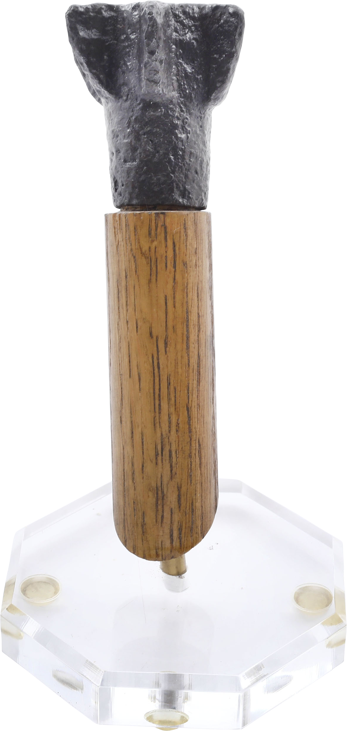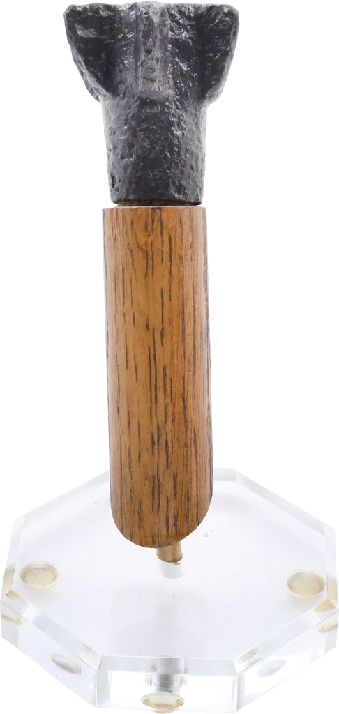 2 3/8” (2.37”) height, a cylindrical socket with capped end and six angled flanges. See, Arms and Armor of the Crusading Era, Nicolle pl.251b. A horseman’s mace, with wood haft would have originally been 22-25” length. Its relatively small size reflects the light weight of the protection worn by the Saracens who sacrificed bodily protection for speed and agility. Excellent excavated condition. Fine plexiglas mount with portion of the haft replaced.