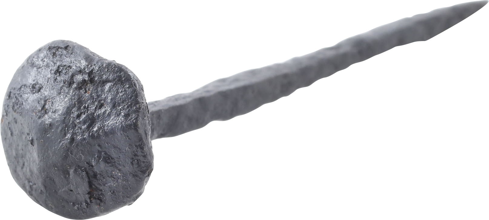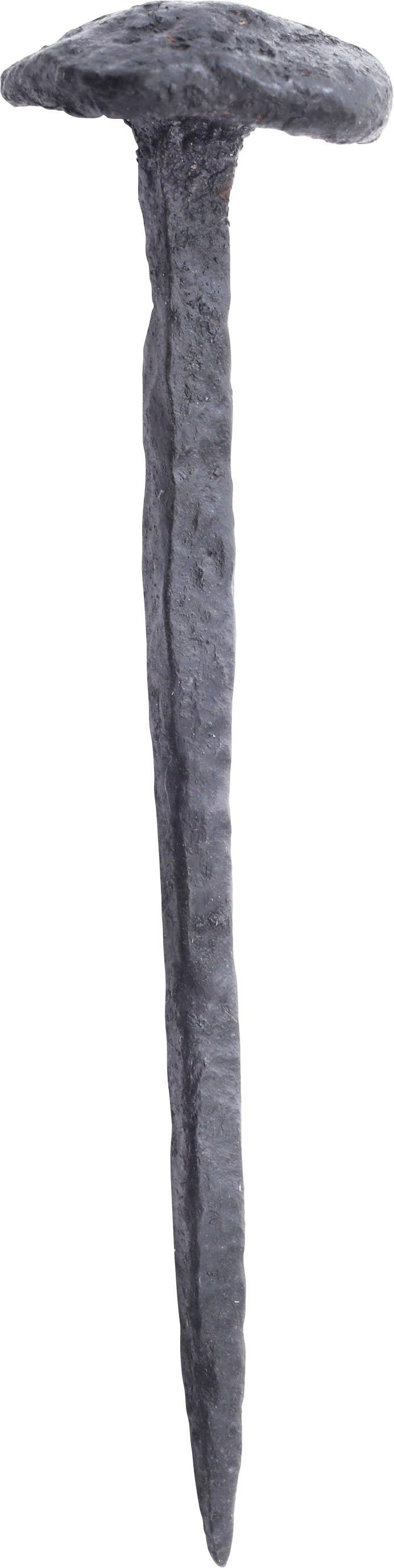 Forged iron, just under 3 1/8” (3.11”) length with an overbroad square head and long thin spike. Archeological evidence indicates that common nails were used for crucifixions. However, virtually all of those are nails embedded in ankle bones. As the nails for securing hands were in soft tissue, no such combinations survived. For the same reason, the heads of those nails must have been expanded to secure the hands as standard nails would have simply pulled out under the weight of the body. These large head nails are believed to be for crucifixions and no other function is known or suggested for them. Crucifixions were very common throughout the entire Roman Empire. From a small group acquired last year.