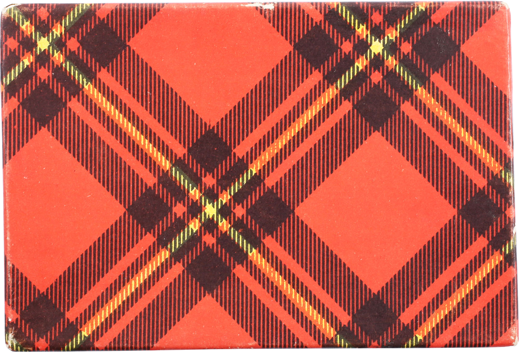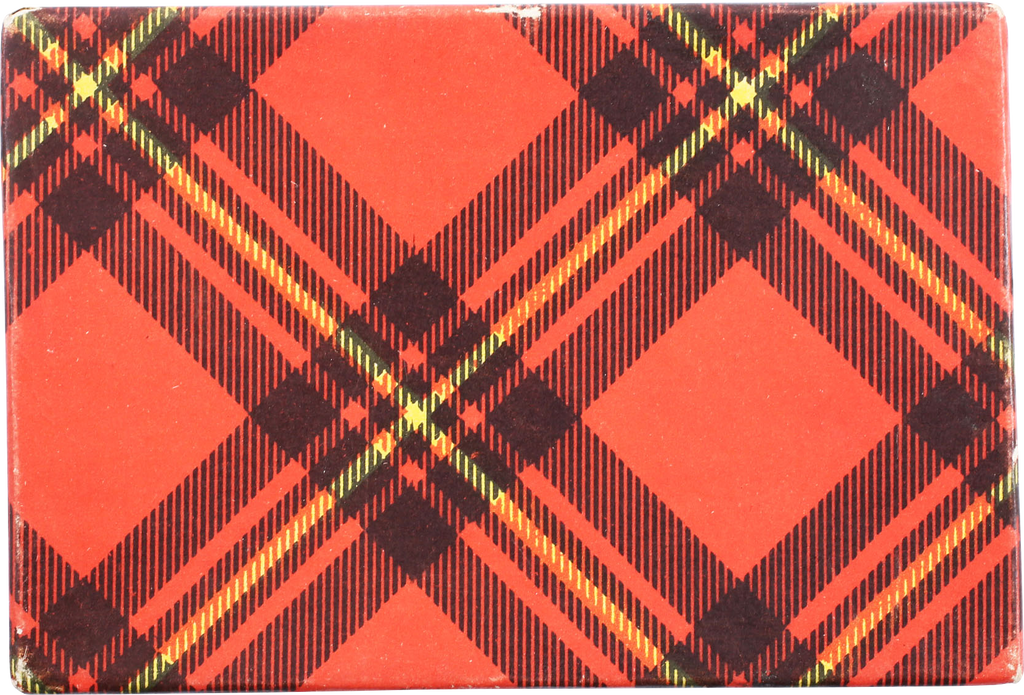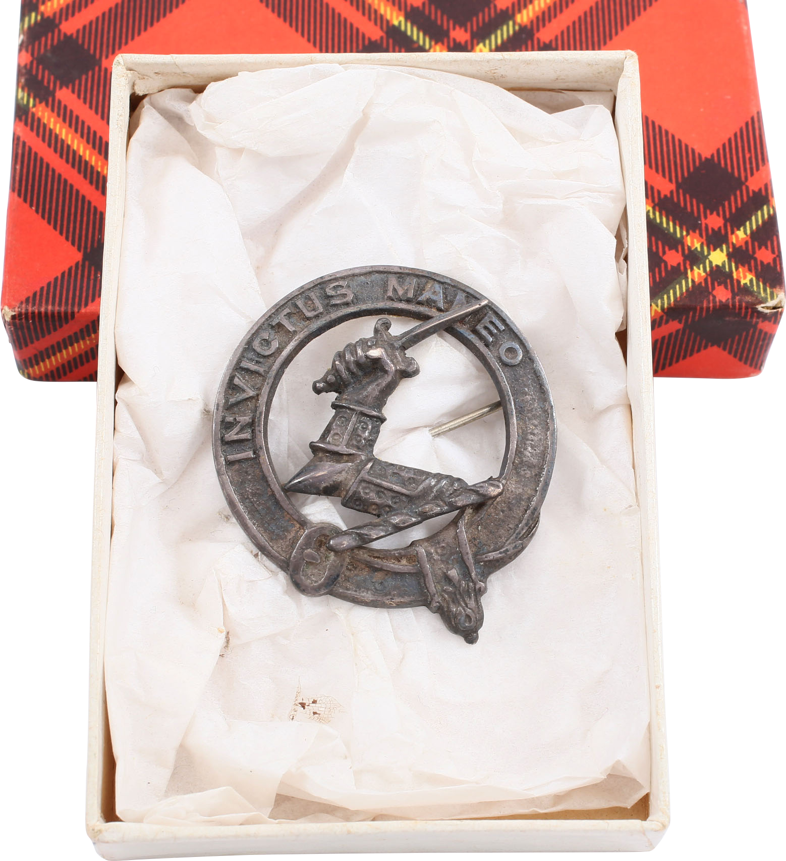 1 3/4" overall with armorial charge of a raised arm with sword and motto INVICTUS MANEO. Contained in its plaid-covered pasteboard box.