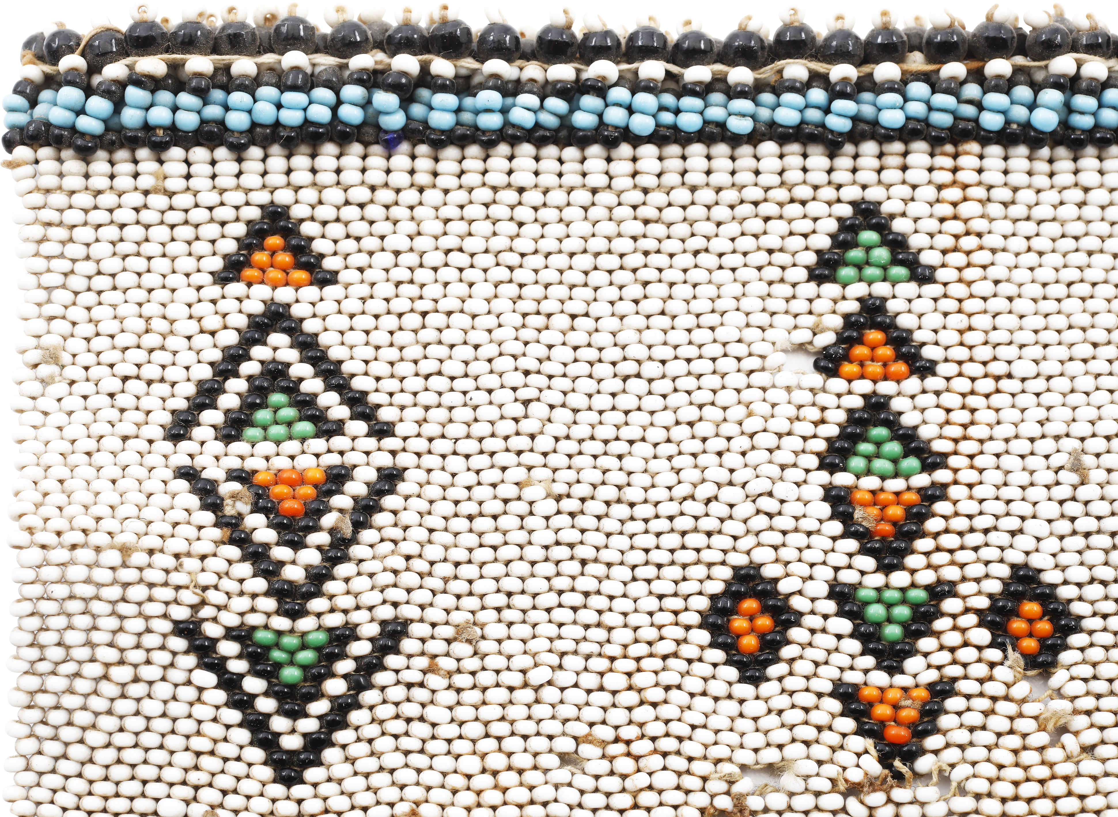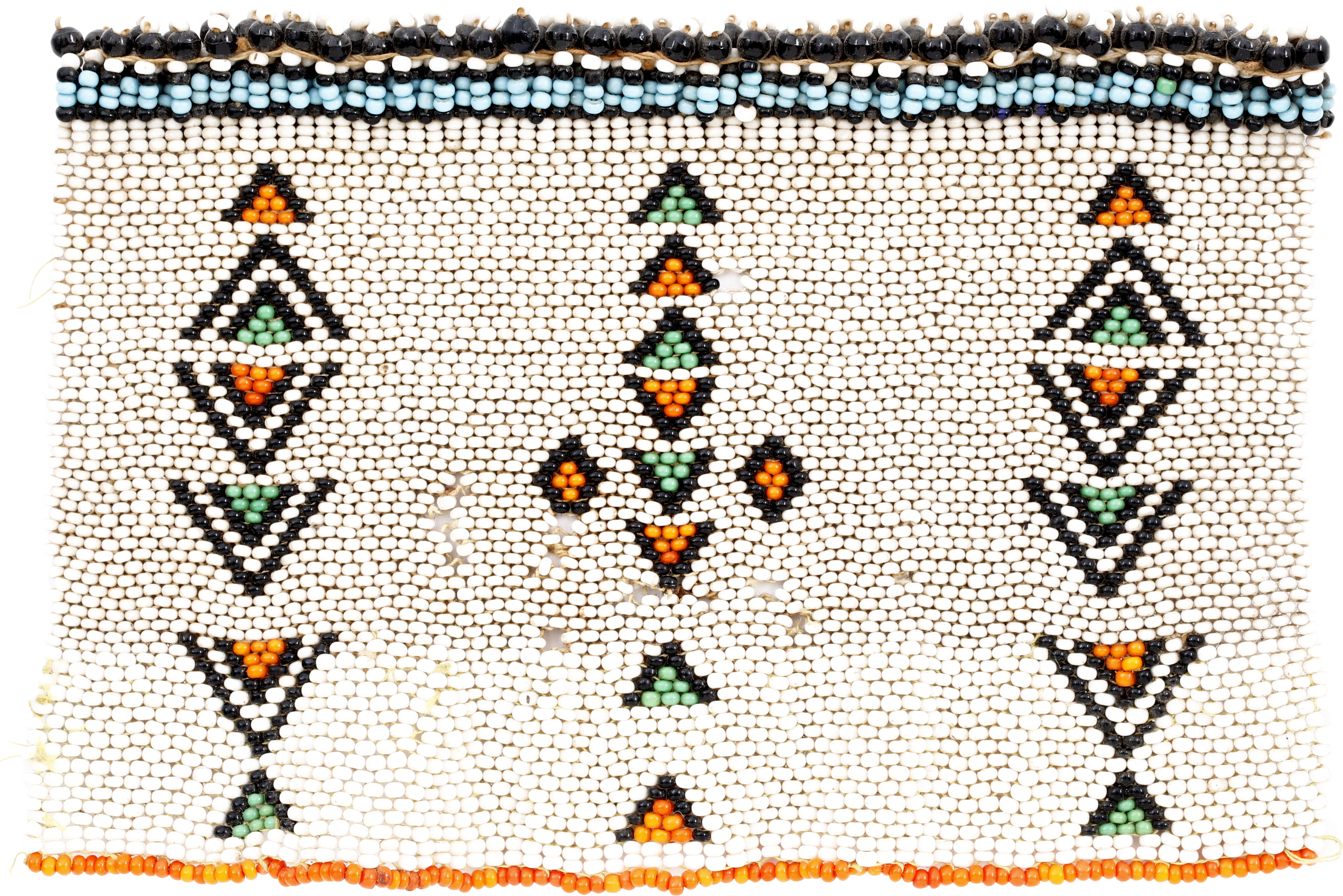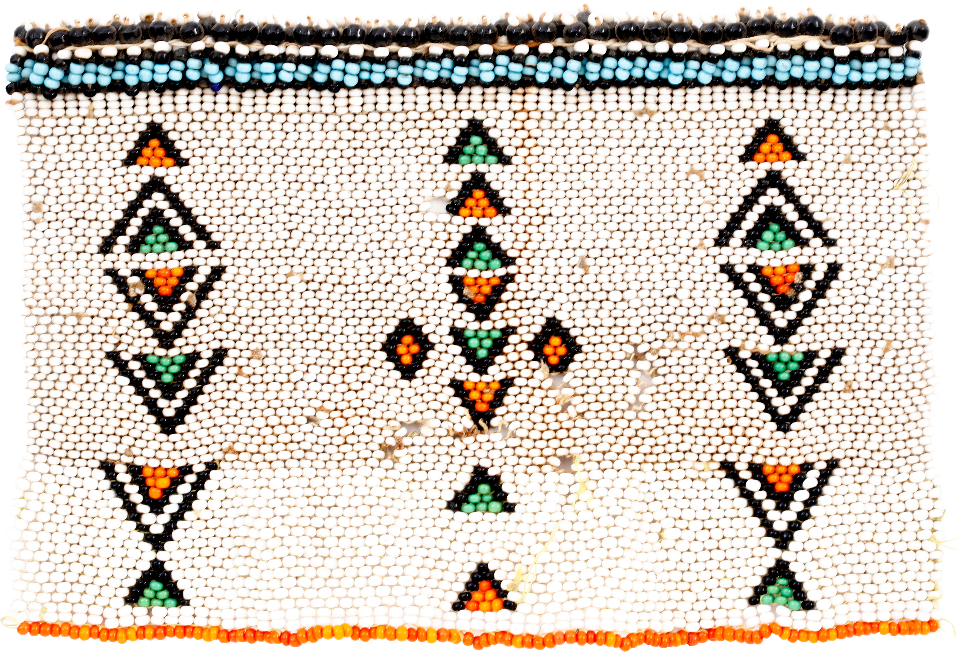 Soldier’s battle trophy from the Zulu War of 1879. Beaded panel incorporating the clan badge of the suitor which was given to the maiden and worn to advertise her alliance, commitment and unavailability. 6 5/8” x 4 ½” loomed. The upper edge doubled. About 15 beads lacking as shown.