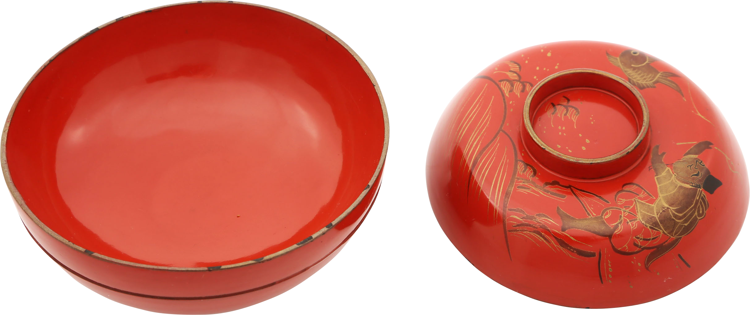 4 5/8" diameter. Rounded profile with thickened bowl edge (short hairline crack). Deep red/orange body color. The top with comical representation of a man catching a fish on turbulent waters. True gold details. Charming and whimsical example in bright colors.