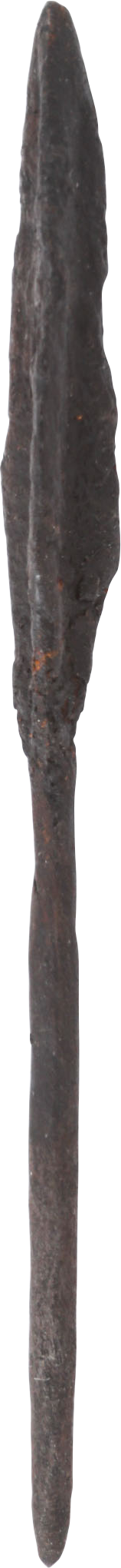 1st-3rd century. Iron, triangular section flesh cutting example. Over 3 1/2” (3.53”) length. The period of Roman conquest of Western Europe including Britain, which had previously remained independent by paying tribute to Rome. At the time, the British people were tribal and protected in battle by heavy leather garments. These triangular points were evidently superior in penetrating as they produced less surface friction than flat points.