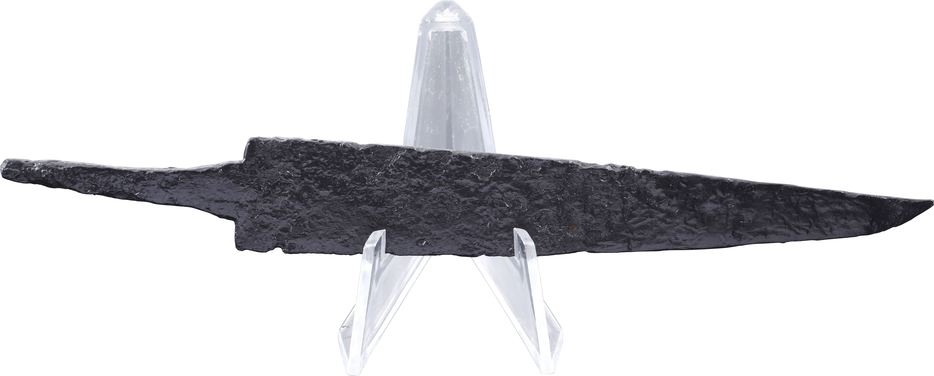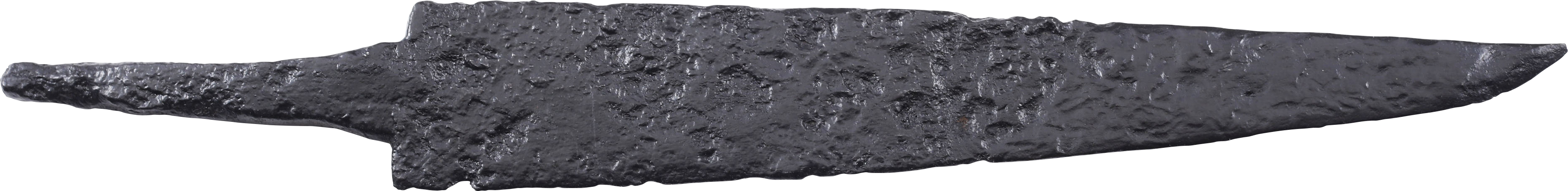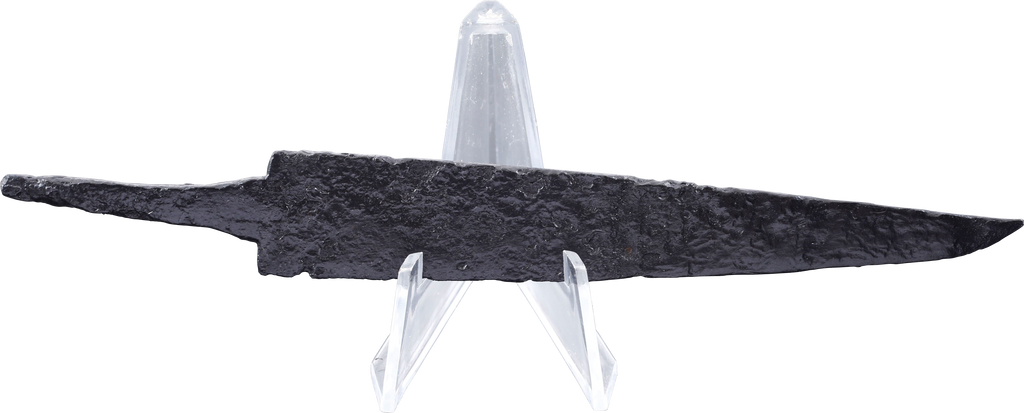 6 5.8” length with wedge section blade with slightly up turned point. The root (base) squared to mount to a cast, probably figural hilt. The precursor to the scramseax (scramasax) which evolved in the Migration Period following the fall of the Roman Empire, in Viking and Frankish forms. This example is distinguished by the typology of the blade form. Later forms were made with a whittle tang seated directly into a bone or other material grip, without a base expansion or guard and generally, with the blade base angled for purchase in the grip. Very rare and fine large example in exceptional preservation. With Plexiglas display stand and certificate of authenticity.