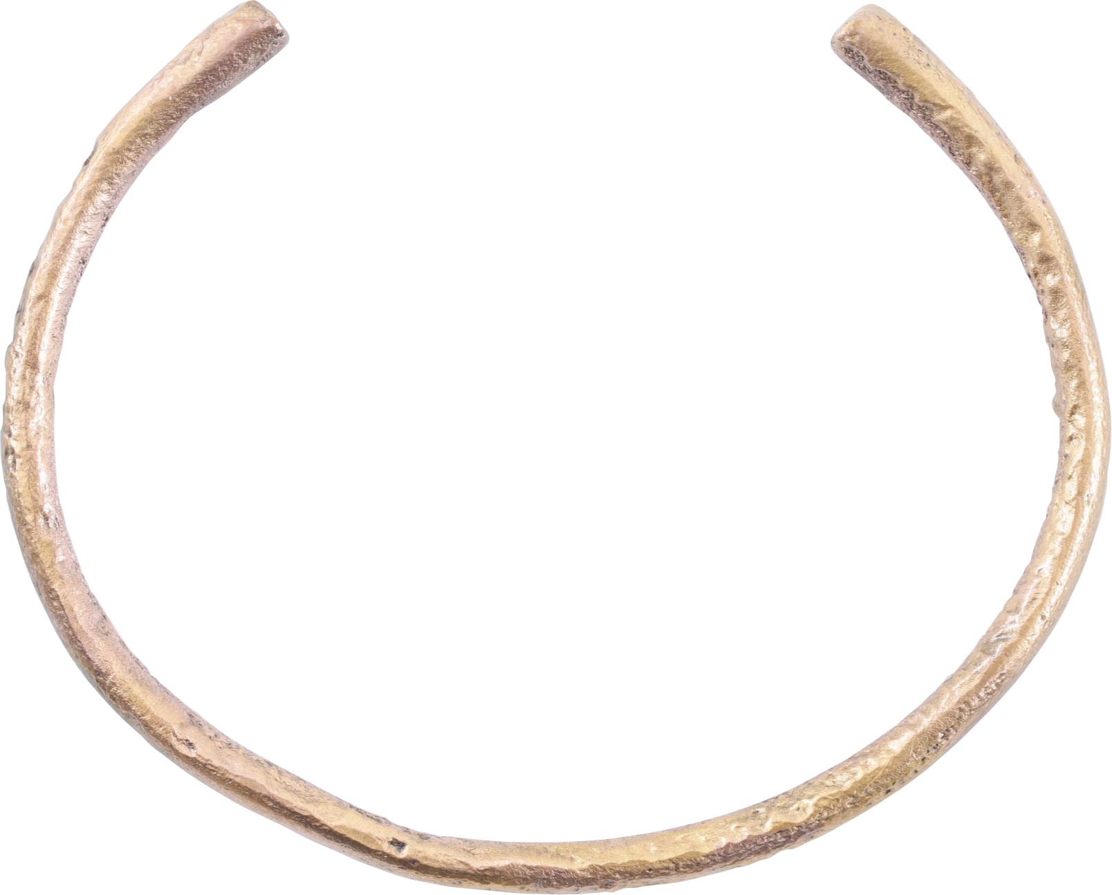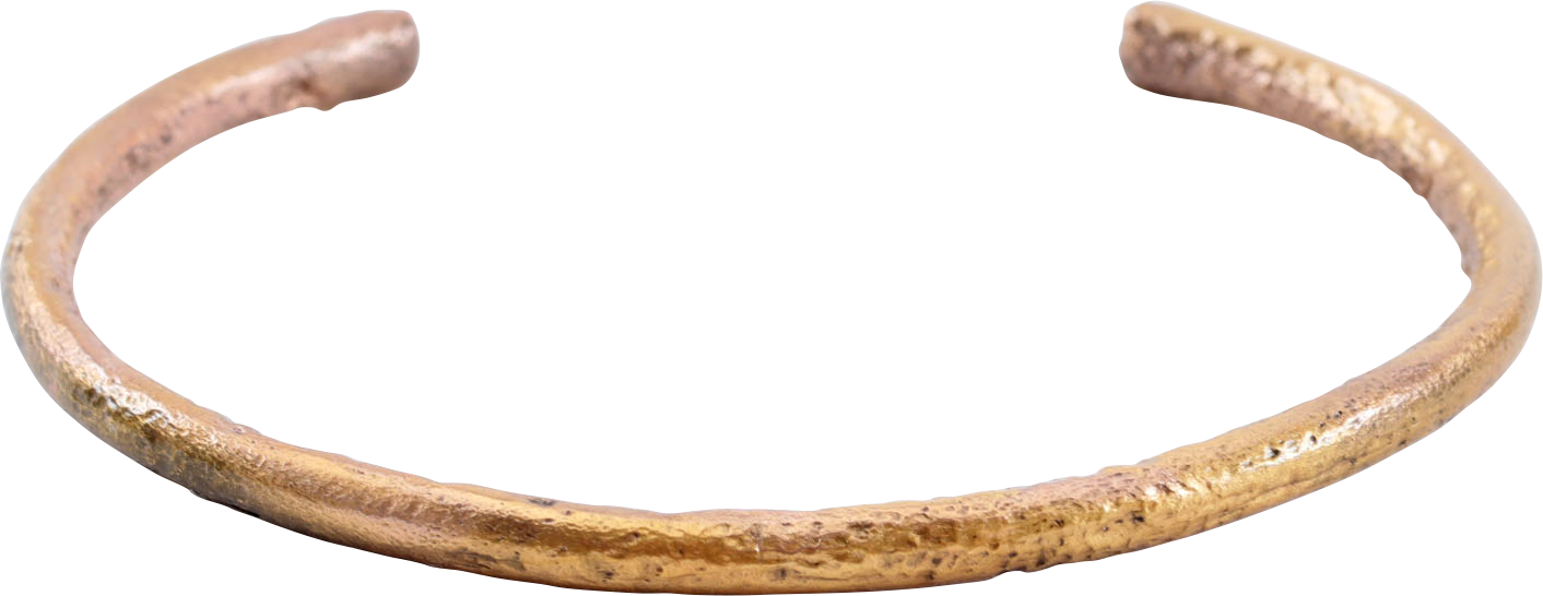 Gilt bronze. C form tapering slightly from the center to the terminals. 3.0mm thick in the middle. 2.46” inside dimension with 1.37” opening. Surface textured from burial and restored with 24karat gold. Gift boxed with certificate of authenticity.