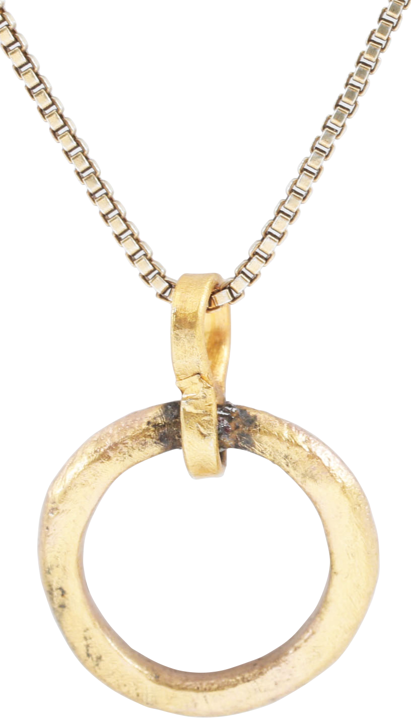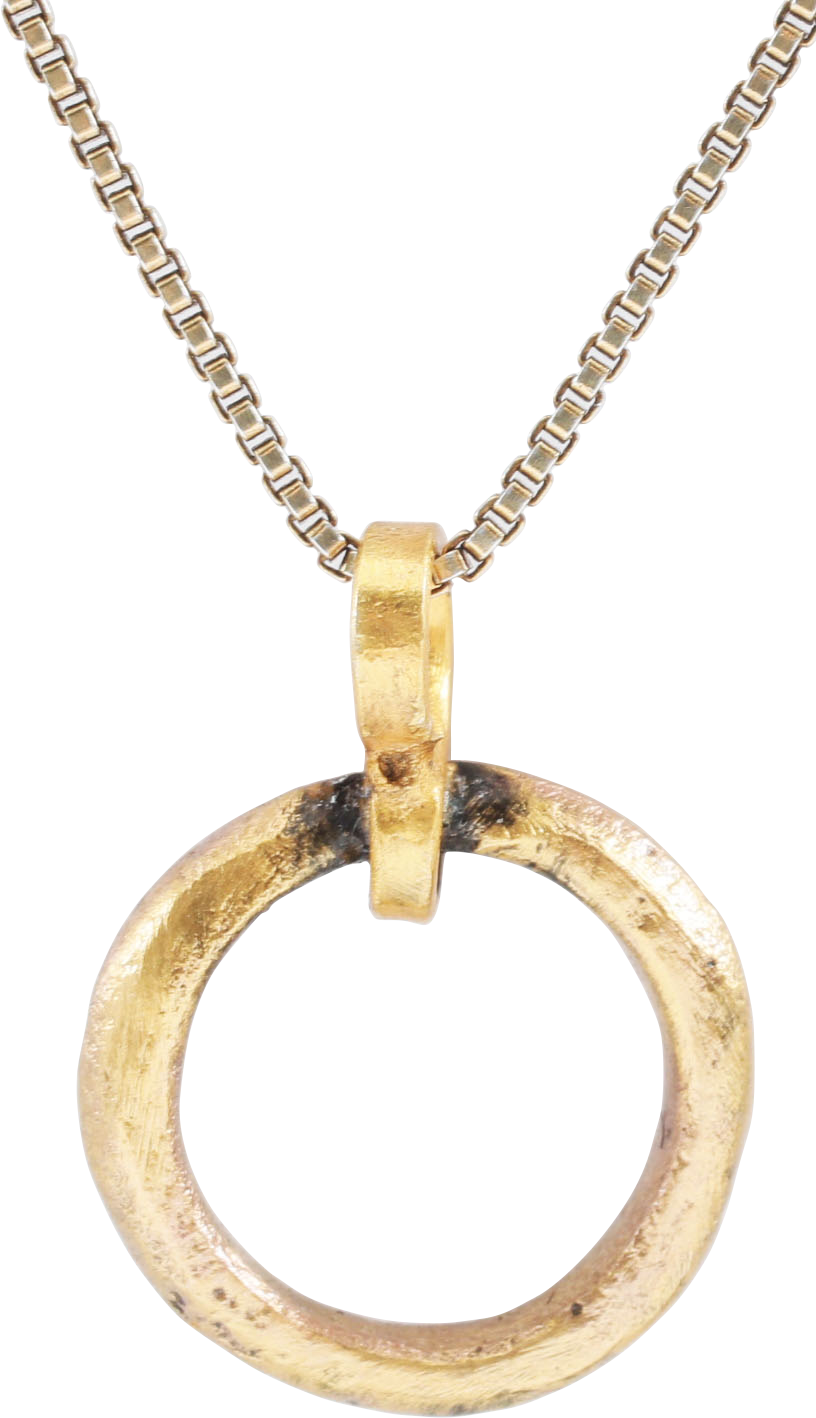 Round with rounded face and flat inside, 0.38” inside diameter and 0.52” outside. The use of beard rings by Vikings is well documented though very few genuine examples survive. Surface textured from burial. Professionally refurbished for modern wear with the 24karat gold overlay restored on an 18” gilt sterling silver neck chain for modern wear. Worn by a Viking 1000 years ago! Gift boxed with a certificate of authenticity.