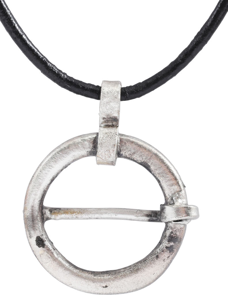 Silvered bronze. Worn in numbers on the surface of the jerkin, to provide a measure of protection against sword cuts and, in fact, were a form of armor. See current Public Television programming for documentation of these in action. As protectors, they also held spiritual significance for the warrior. About 1” (0.98”) diameter.  Low rounded, near flat faces with rounded inner and outer edges. The surface lightly textured and worn from burial. Professionally refurbished with the pure silver overlay restored, on an 18” Sterling silver neck chain for contemporary wear. Jewelry gift boxed with a certificate of authenticity. Delicate form. Worn by a Viking warrior 1000 years ago!