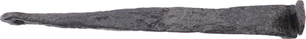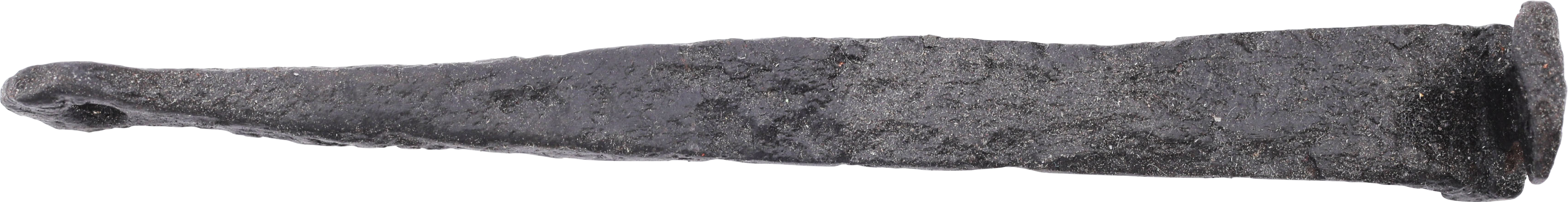 Finely forged example, 4” length. Tapered rectangular section shank, with medial step and pierced ring terminal. Opposite with right angled intricately keyed bit. Excellent conserved condition. The capture and trade of slaves was a principle Viking occupation with the typical Viking household having a slave dwelling outbuilding. It is estimated that by 1100, ten percent of Europe’s population was enslaved.