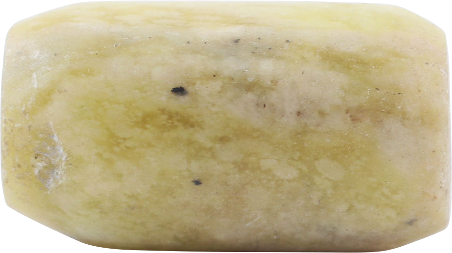 Provincial example made from mottled yellow stone, perhaps jadeite. Over 3/8” diameter and just under ¾” (0.70”) length. Drilled for stringing.