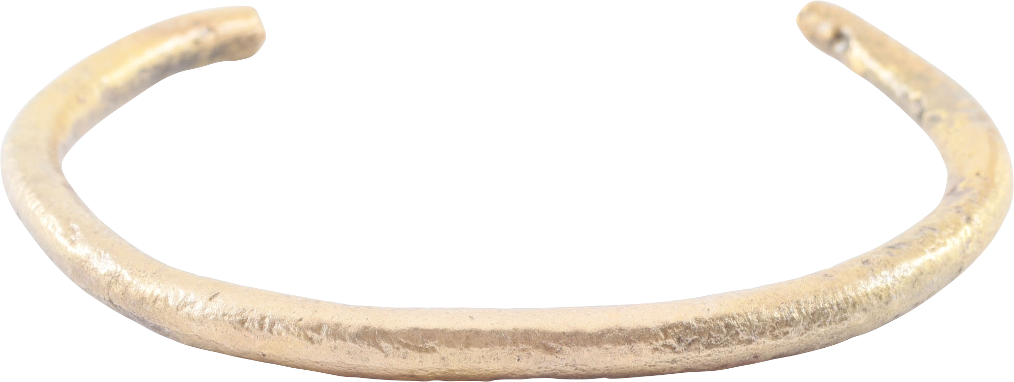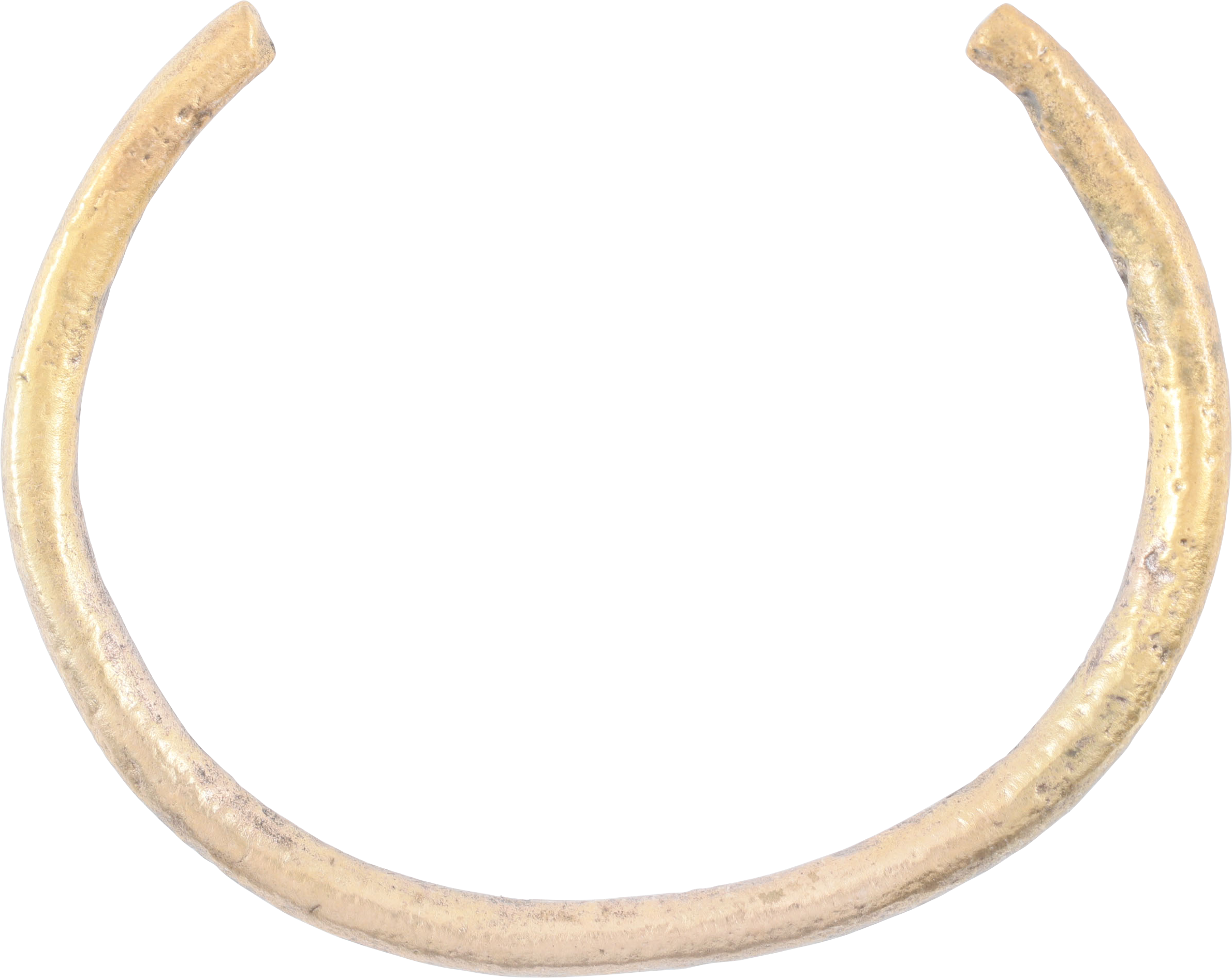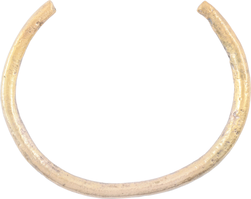 850-1050 AD. Exceptionally heavy and somewhat crude suggesting provincial manufacture. 2.47” inside dimension and 3.28" outside. Suitable for wear on the wrist or forearm and possibly made for a Viking woman warrior. Cast bronze, C form, circular section tapering slightly from the center to the terminals. Surface degradation from burial. Professionally refurbished with the 24karat gold overlay restored for contemporary wear. Gift boxed with certificate of authenticity.