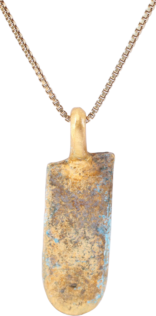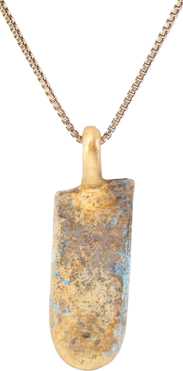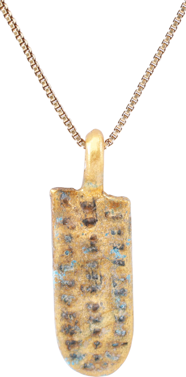 10th-11th century AD. Vikings were highly skilled metallurgists, and as a result, breaking metal had supernatural significance for them. Breaking ringjarn (iron rings) as shown on the Larbro Stone, was thought to destroy the spirits of enemies. Similarly, Viking weapons and accouterments were broken for burial with their owners. This is the broken end of a fine Viking woman warrior's bronze bracelet. It is about 7/8” x 3/8” and cast and punch decorated .  It is the end of a woman warrior’s bracelet, broken in the funerary process. It is well documented that women fought along side men and women’s burials containing swords, other weapons and armor are documented. The surface is textured from burial. It was handcrafted by a Viking artisan 1000 years ago, worn by a Viking woman warrior, and broken as part of her funerary ritual! It has been professionally refurbished with the 24karat gold surface restored and mounted to a gilt Sterling silver 18” neck chain for modern wear. It comes with a certification of authenticity, and a gift box.