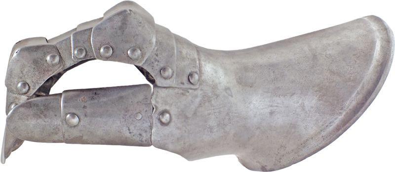 This fine gauntlet is from a late Gothic armor made with an armlet. The one-piece cuff displays the finest hammer work resulting in an elegant three-dimensional form that flows into the thumb and metacarpal plates beyond the anthropomorphic knuckle plate. Articulation for the fingers is achieved with five hinged ribbed plates. Armors of this type are exceedingly rare with most surviving examples in Italian museums. This gauntlet ranks among the finest of elements for these armors.