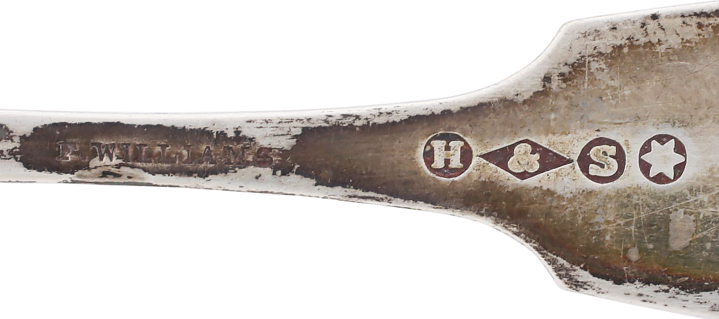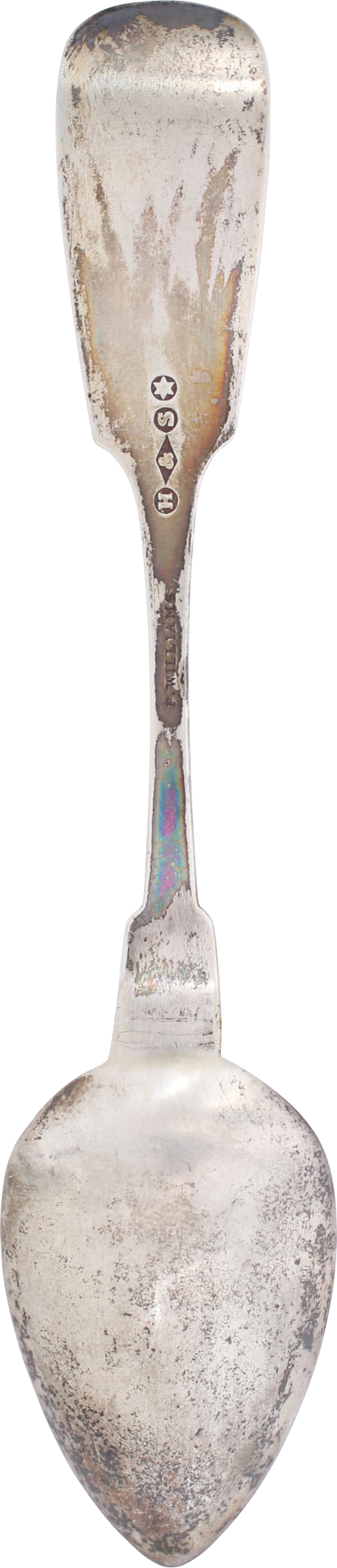 Tea spoon, 5 7/8” (5.93”) length of delicate proportions. The end with monogram C F and the reverse with maker’s name F WILLIAMS. Found in Grosse Pointe Michigan, together with our B5226 inscribed Cadillac, and likely descended through the family of Antoine de la Cadillac, founder of Detroit in 1701. Worth research.