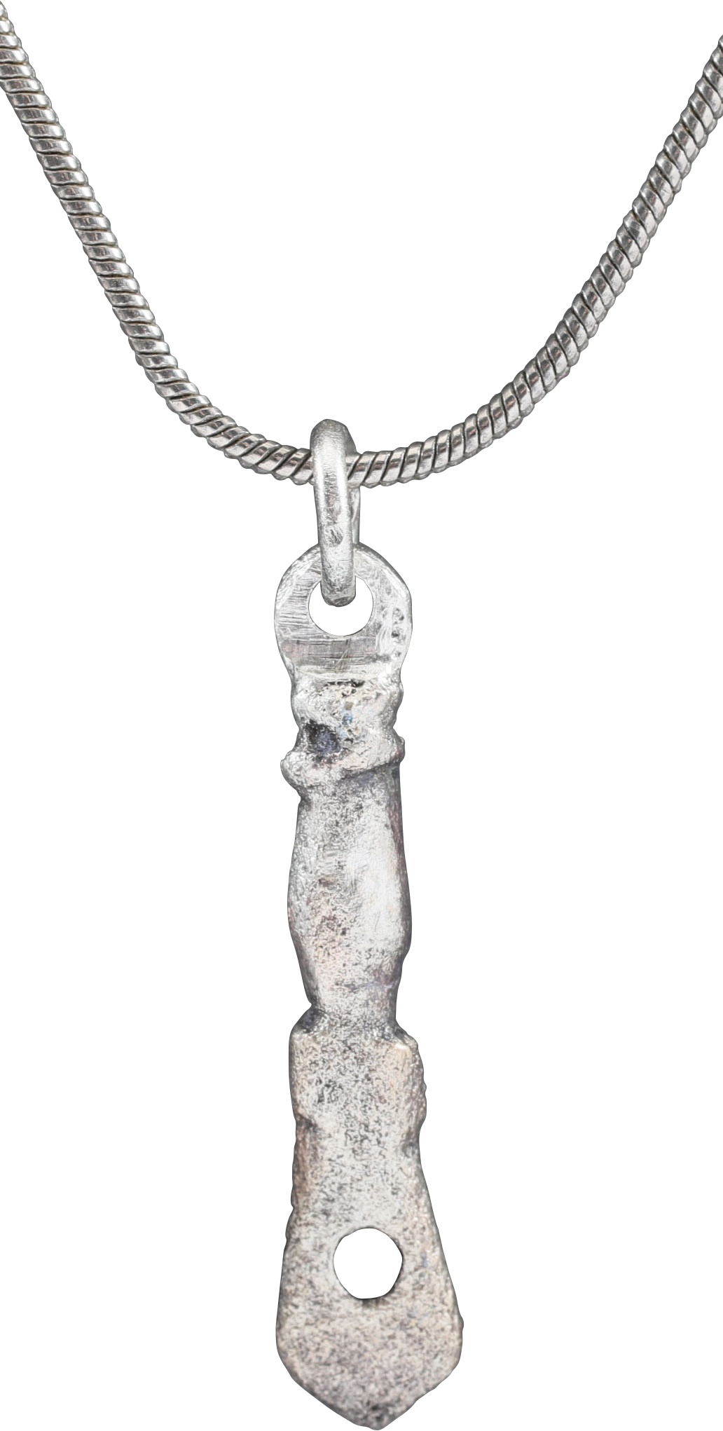 Imperial Period. Silvered bronze, 1 1/8” (1.10”) total length. Baluster form with a pierced spatulate terminal. Symbolism unknown, but possible representing sporting equipment. Professionally refurbished with a silver overlay and mounted to an 18” sterling silver neck chain for modern wear. It comes with a certification of authenticity and is jewelry gift boxed.