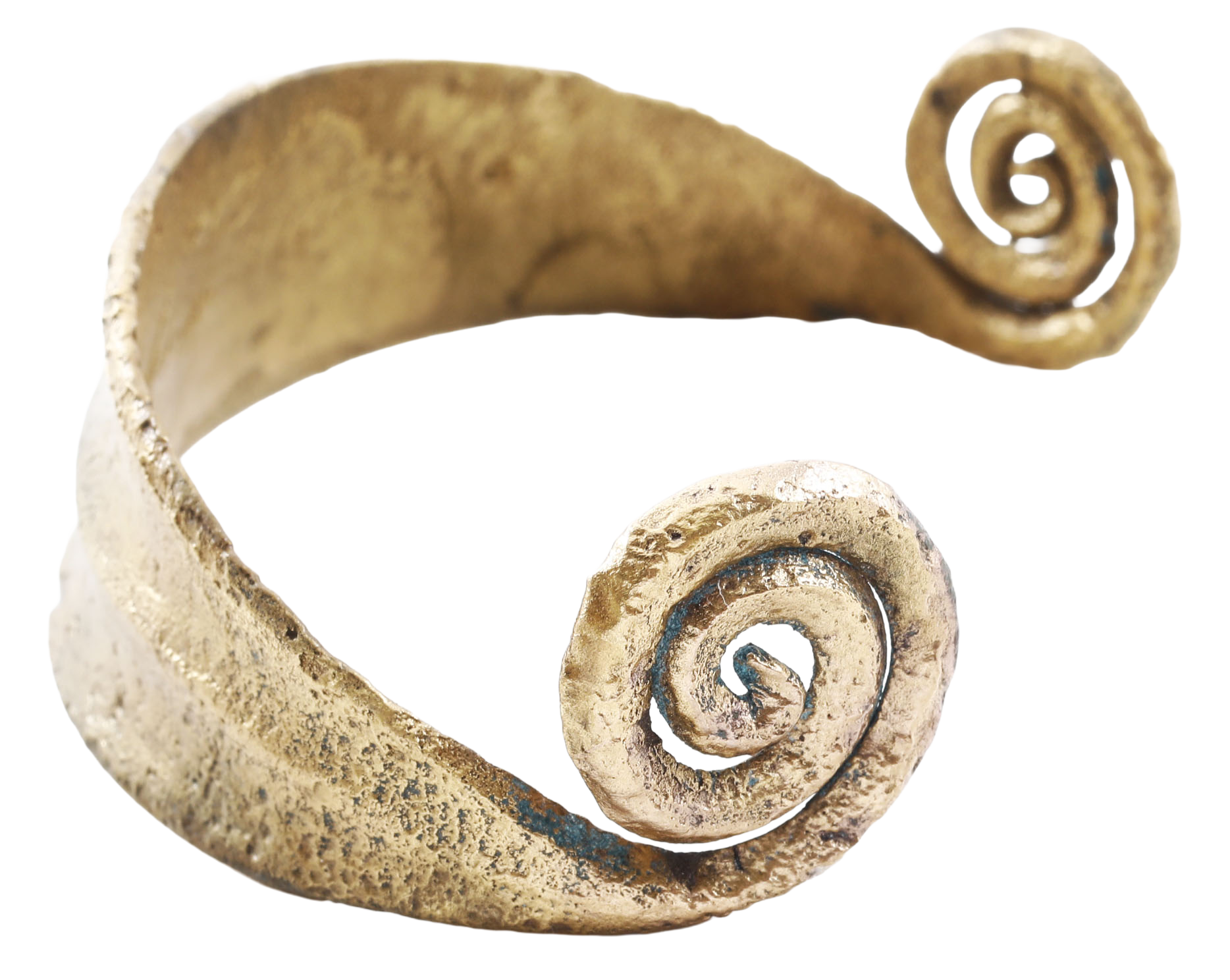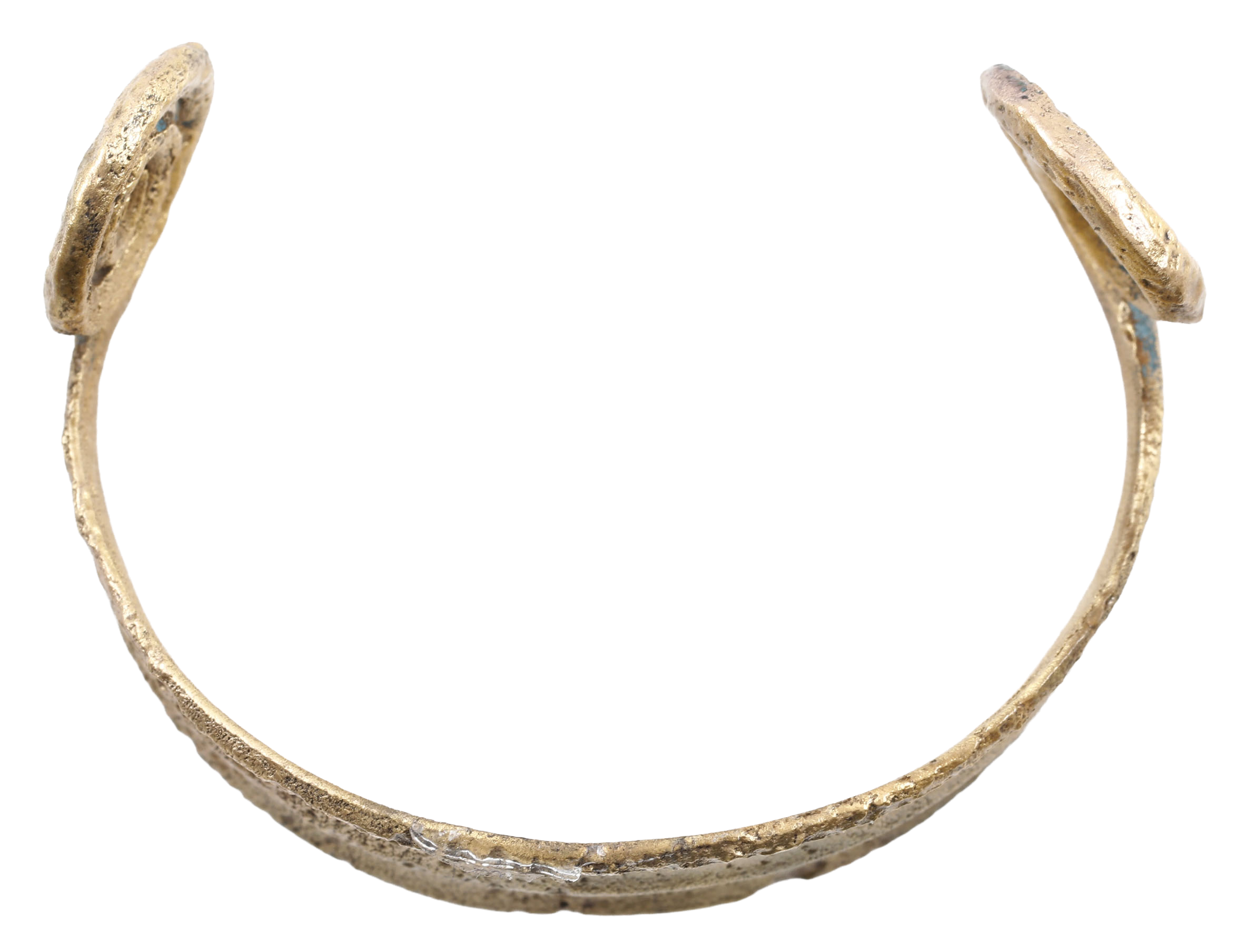 Germanic, silvered bronze, C form 2.39” inside and 2.58” outside. Low rounded section band with large lenticular medial with double line bordered broad rounded ridge. Surface textured from burial and professionally refurbished with the 24karat gold overlay restored for modern wear. Gift boxed with certificate of authenticity. 3000 years old original!