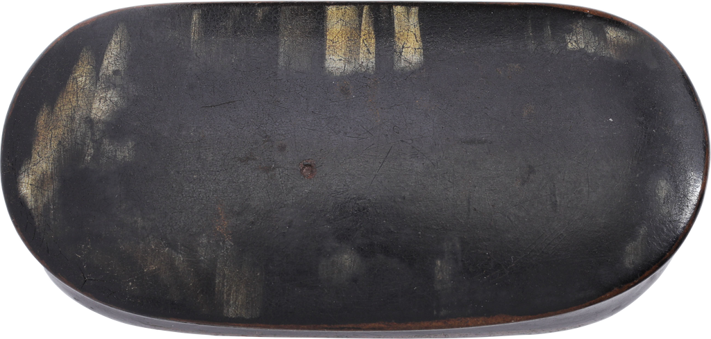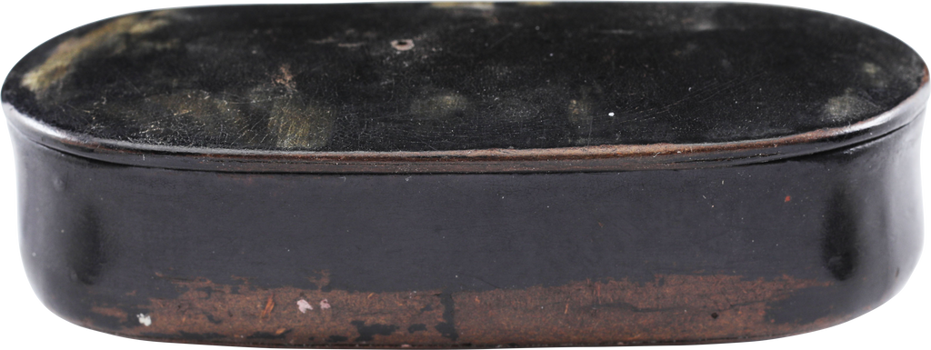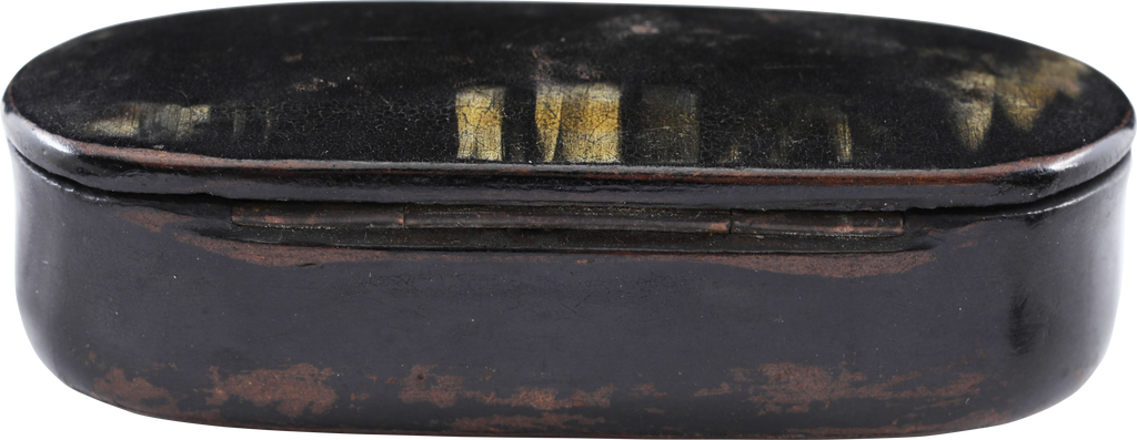 3 3/8” width, lozenge form, black japanned papier-mâché. Piano hinge securing the slightly domed top. Faded simulated tortoise pattern, with some, wear from use. See Collectors Illustrated Encyclopedia of the American Revolution, p.246 for other examples.