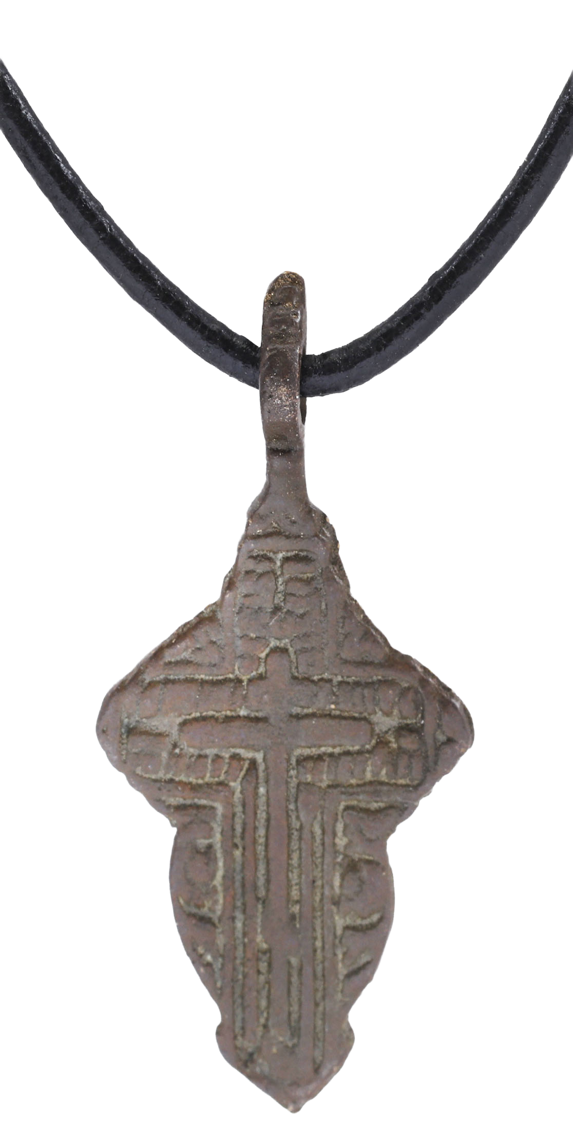 Orthodox rite. Bronze or copper. Over 1 1/2” (1.53”) total height. Raised border delineating the cross with broad beams, the cross beam above center and enclosing a stick cross with Cyrillic inscriptions at the terminals. Reverse with a similar cross with Cyrillic inscriptions. The outside edges in flowing baroque elements. Excellent preservation with crisp detail. On an 18” sterling silver mounted polished leather neck cord for contemporary wear. Jewelry gift boxed with Certificate of Authenticity.