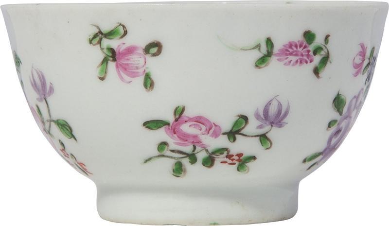 New Hall (Staffordshire) C.1790. 3 1/16" diameter with stepped scalloped ("shanked") body. White with rococo garland inside border. Matching sprig to the bottom. The outside with six flower and stem motifs. See Victoria & Albert Museum C.672&A-1935 for a related tea bowl and plate with near identical decoration and palate. Perfect as made.