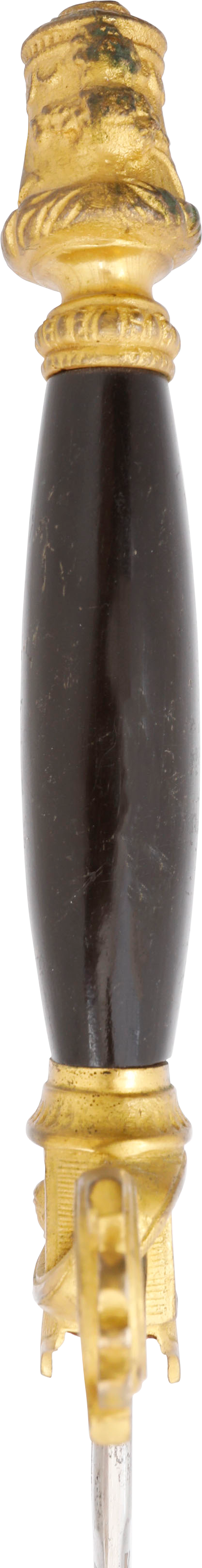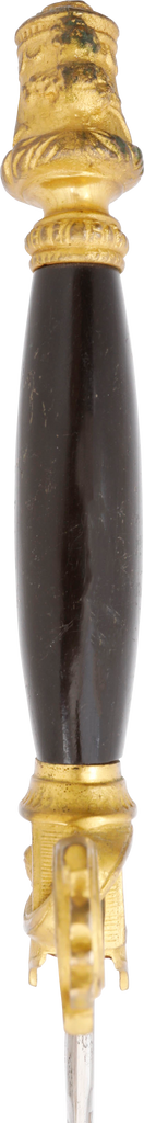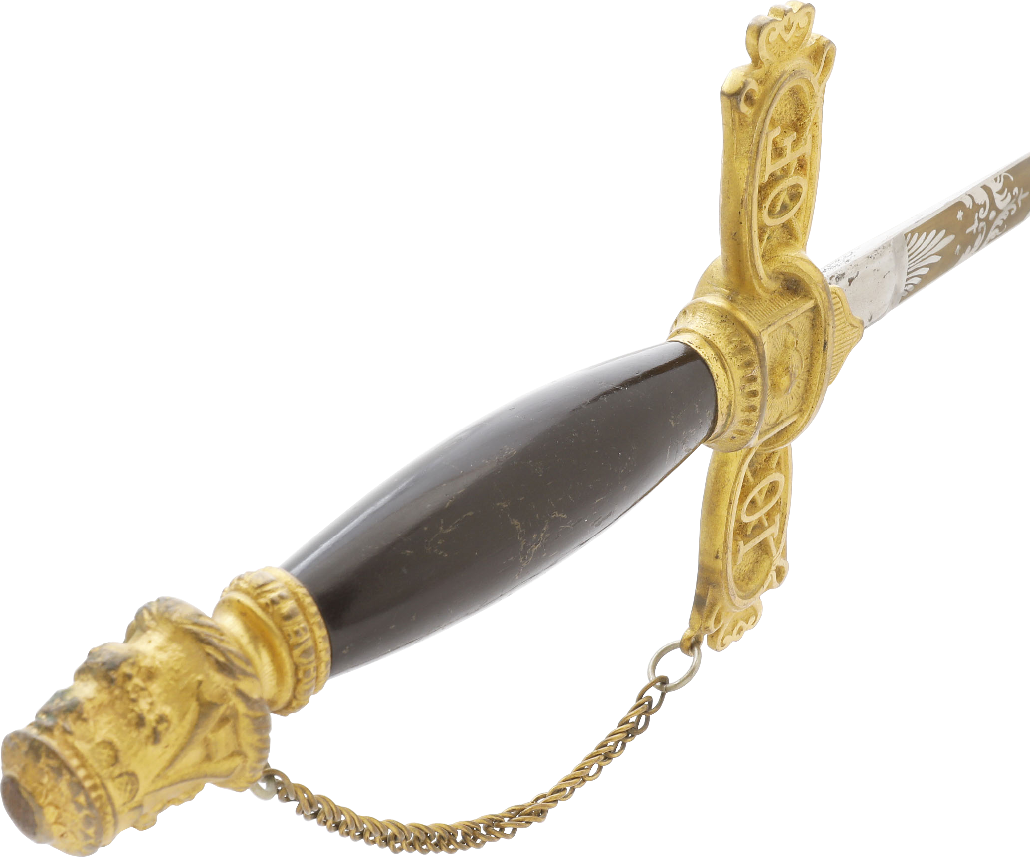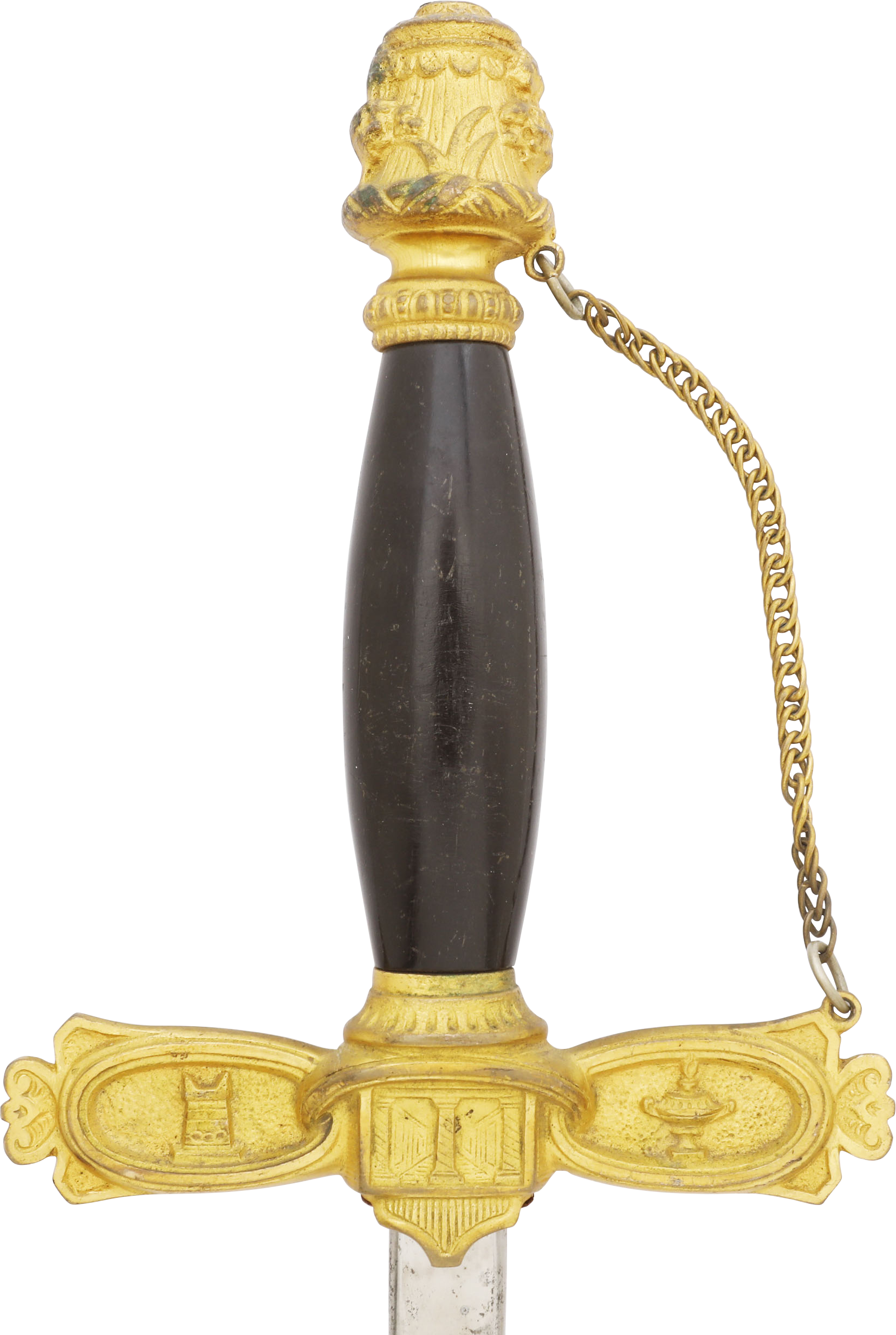 The Odd Fellows, founded in England in the 18th century, was a secret society which promoted brotherhood and good will among its members. It is thought that the name referenced skilled workers in fields outside the organized guilds and thus outsiders to the main workers community. This sword is a fine example, beautifully finished and lavishly overlaid in pure gold, nearly all of which remains in bright presentation. The 28” blade, in virtually as new condition, is decorated with gilt foliate panels with King David Encampment No. 42 Fitchburg Mass. and the owner’s name. Maker’s name f t Littlefield Portland Maine the ricasso. The whole is as fine a preservation as can be found for the period. The owner’s name, C M Flinh, which we ordinarily do not list, is of such rarity as to beg for further research. Exhaustive search by AI reveals a single Flinh family in Maine in 1880. As information on the internet evolves, it is likely that further details of the family and this sword’s owner will become available. That aside, it is as fine a sword of the period as can be found. If it were a military sword, it would command a price in the $3000-4000 range.