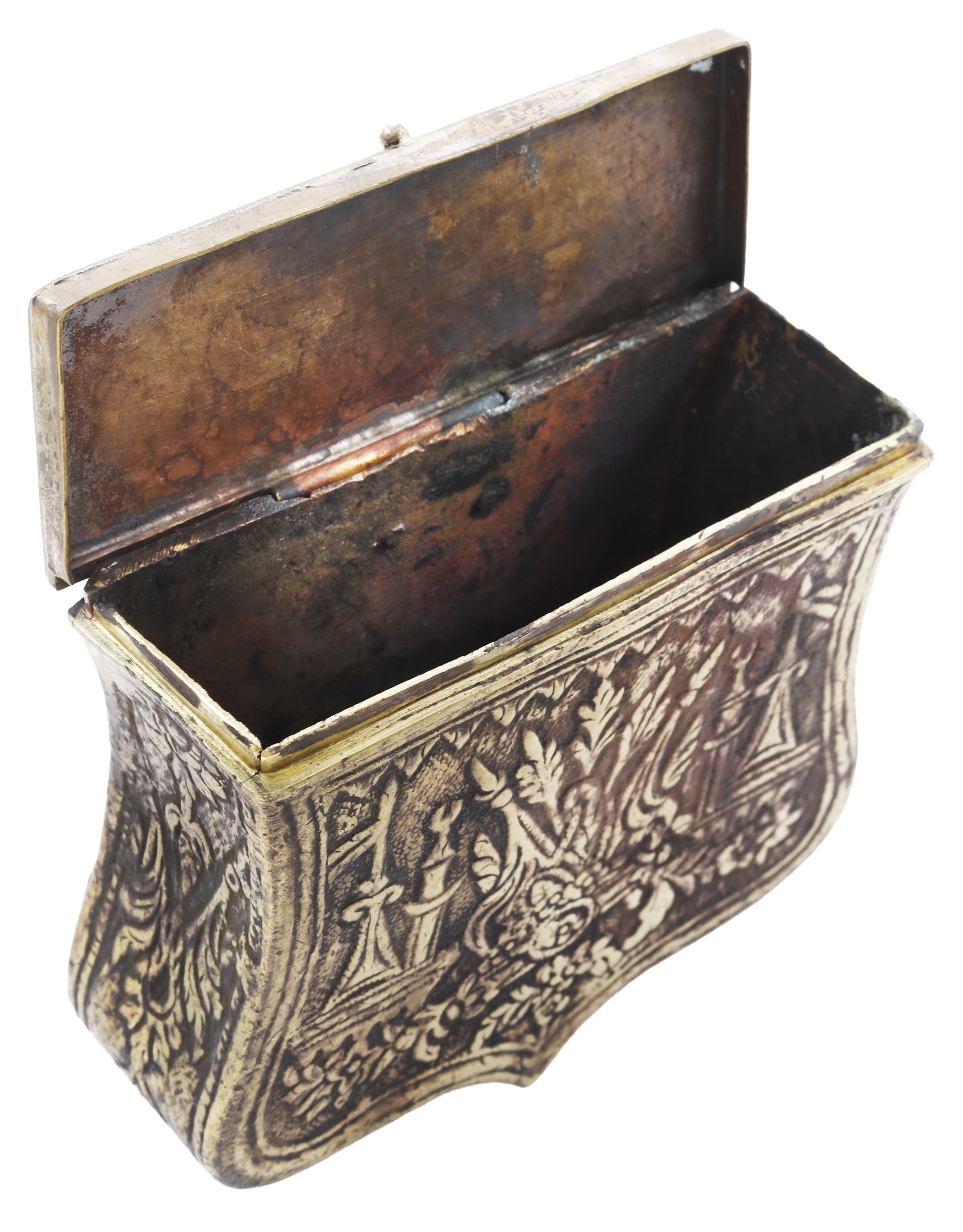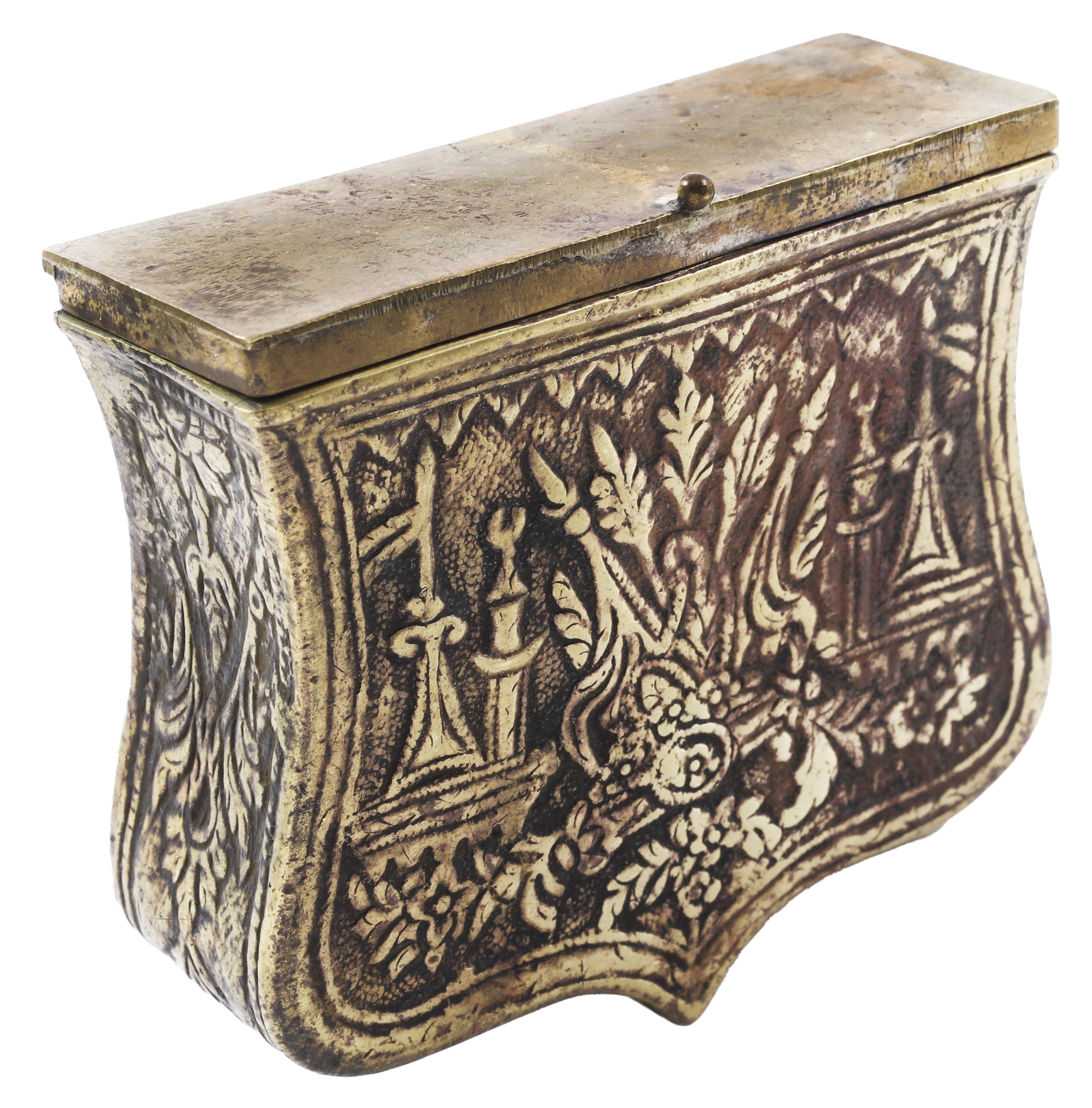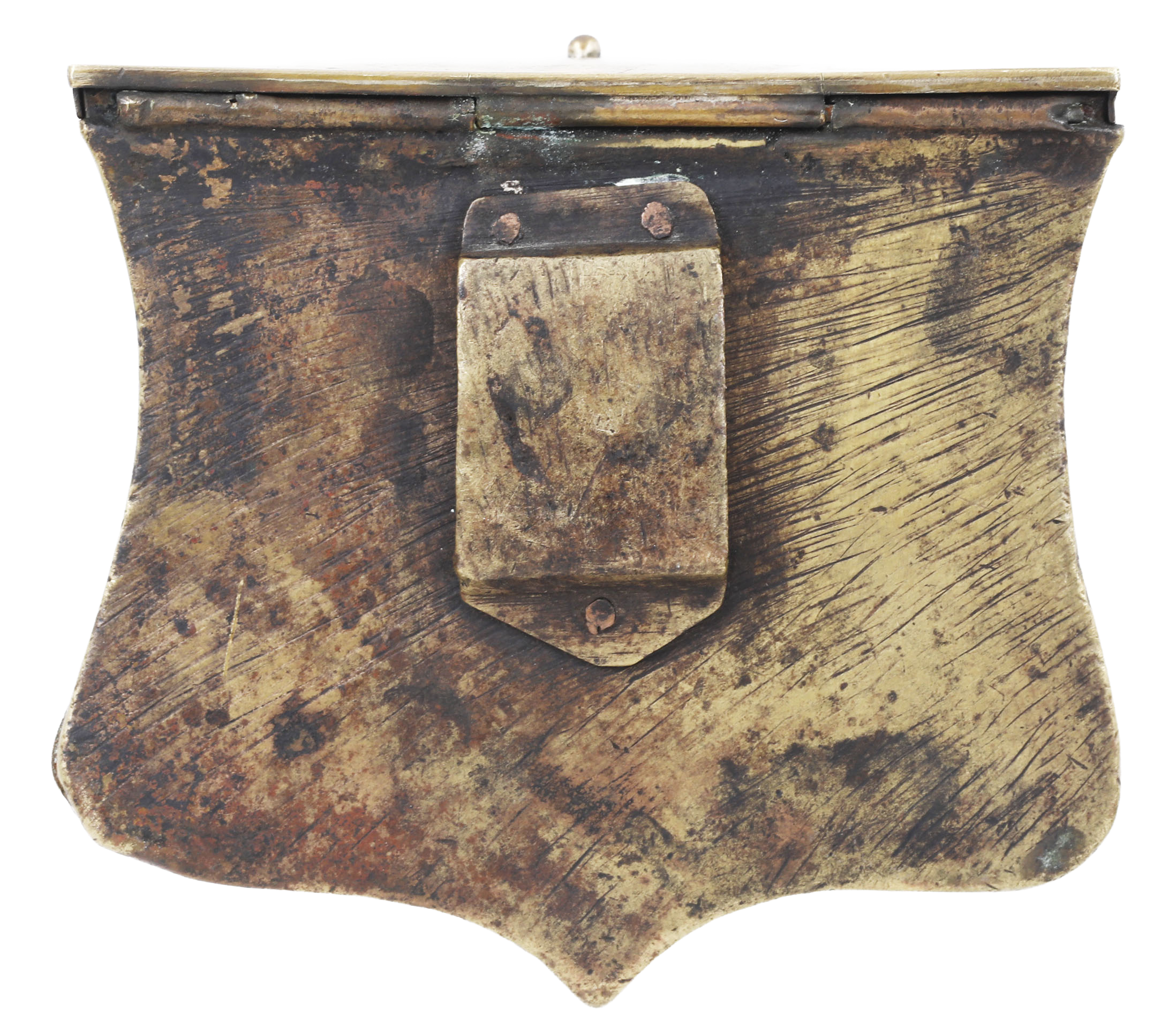 Brass or bronze, 3 ½” height with relief decoration of foliage, military trophies and swords to the front and sides. Reverse, plain with belt mount. Plain flat top on piano hinge. Dark patina with remnants of old polish.