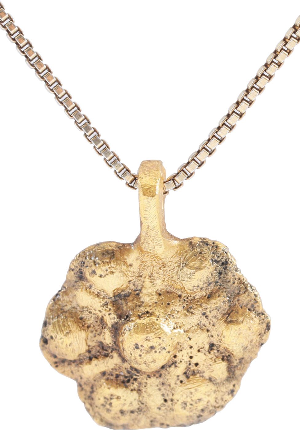 The Wheel of Fortune (Rota Fortuna) is one of the most enduring of ancient philosophical or religious concepts. It was pivotal in Ancient Greek and Roman Paganism and smoothly transitioned into Christianity, aided by the Roman philosopher Boethius in his 523 treatises, The Consolation of Philosophy. Its popularity grew with Christianity’s spread, represented in art, including Chaucer and Shakespeare, for two. Its popularity among the common folk who were most likely to be affected by misfortune resulted in widespread reliance on amulets representing the Wheel of Fortune. It is widely depicted on cathedral windows and in literature. This amulet is over 1/2” (0.56”) in diameter (13.4mm), made by the open face mold technique, with relief representation of a six-spoke wheel with raised hub and scalloped edge. It has been professionally refurbished with the 24karat gold surface restored. It is mounted on an 18” gilt Sterling silver necklace for modern wear. Jewelry gift boxed with certificate of authenticity.
