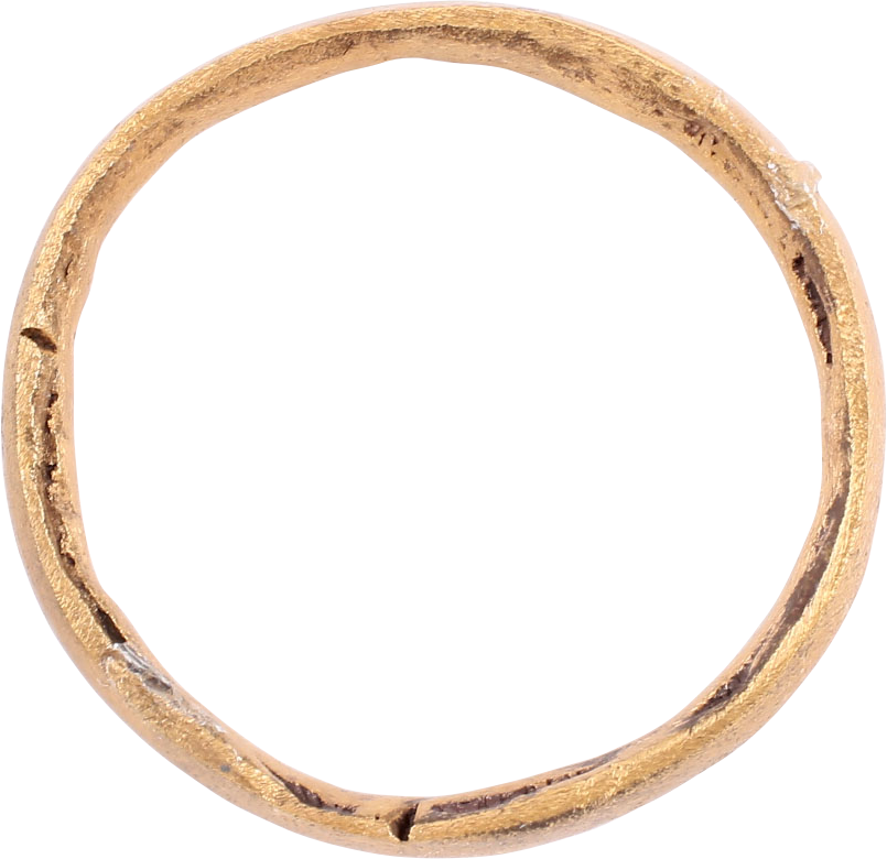 Gilt bronze, size 10 1/2 Broad rounded face band 4.0mm width. The form is of the heavy warrior’s rings. Made with a core filling the inside which distributed the flowing metal and allowed for slower cooling. The core was then laboriously removed by hand and the inside of the ring polished. Remnants of the core are clear inside the ring. Professionally refurbished with the 24karat gold surface restored. Jewelry gift boxed with a certificate of authenticity.
