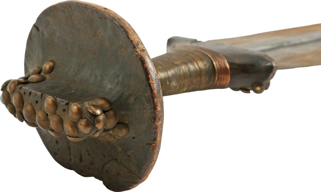 Second half of the 19th century, collected by Baptist missionaries about 1890. 15" trowel shaped blade with raised medial flanked by forge finish segments. Good wood hilt with flared base and especially large wheel form pommel (edge wear) with raised medial. Trade tack decoration to the medial and grip base, one side only. Few tacks missing. Brass and copper wrap to the grip. The blade bright under old preservative. Used in close quarters house raids.