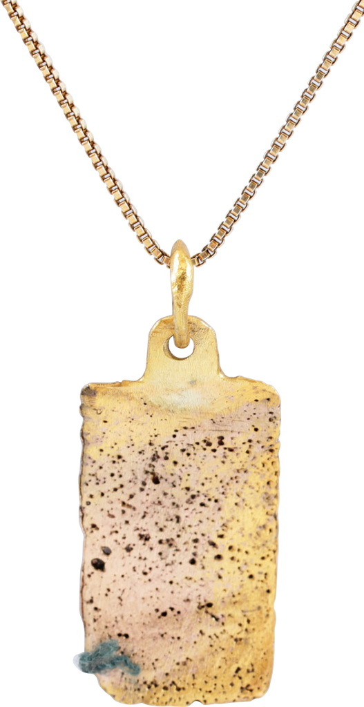Vikings were highly skilled metallurgists, and as a result, breaking metal had supernatural significance for them. Breaking ringjarn (iron rings) as shown on the Larbro Stone, was thought to destroy the spirits of enemies. Similarly, Viking weapons and accouterments were broken for burial with their owners. This is the broken end of a fine Viking warrior's bronze bracelet. It is about 7/8" x 1/2". It is hand-decorated by a Viking craftsman, 1000 years ago! It has a line offset from the middle with pattern each side incorporating curved forms, favored by Vikings. The side patterns are similar with one more developed that the other, suggesting a mystical significance based in Viking pagan religion.  It is professionally refurbished with the 24karat gold surface restorer, on a gilt neck chain for modern wear. It comes with a certification of authenticity, and gift boxed.