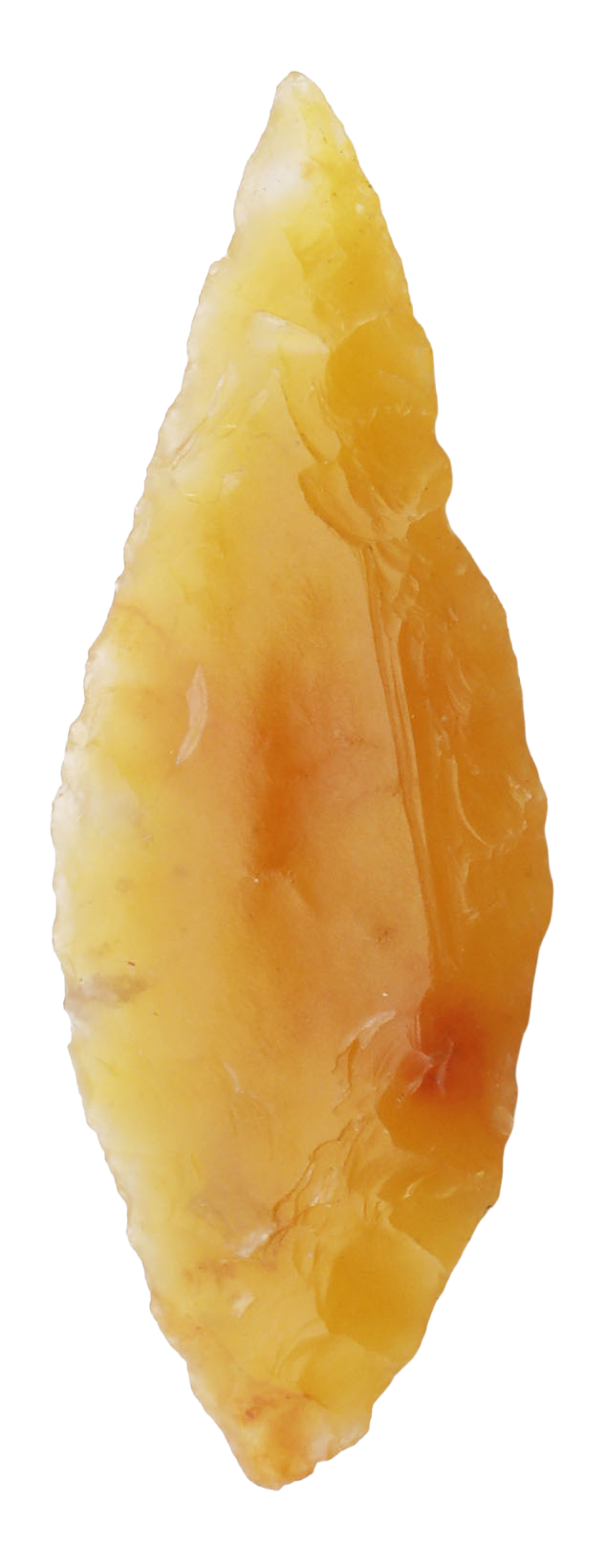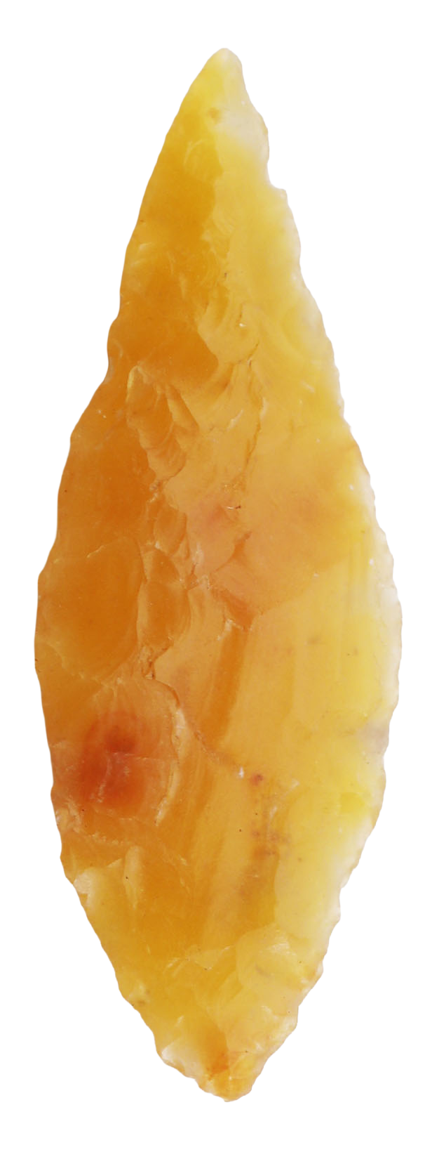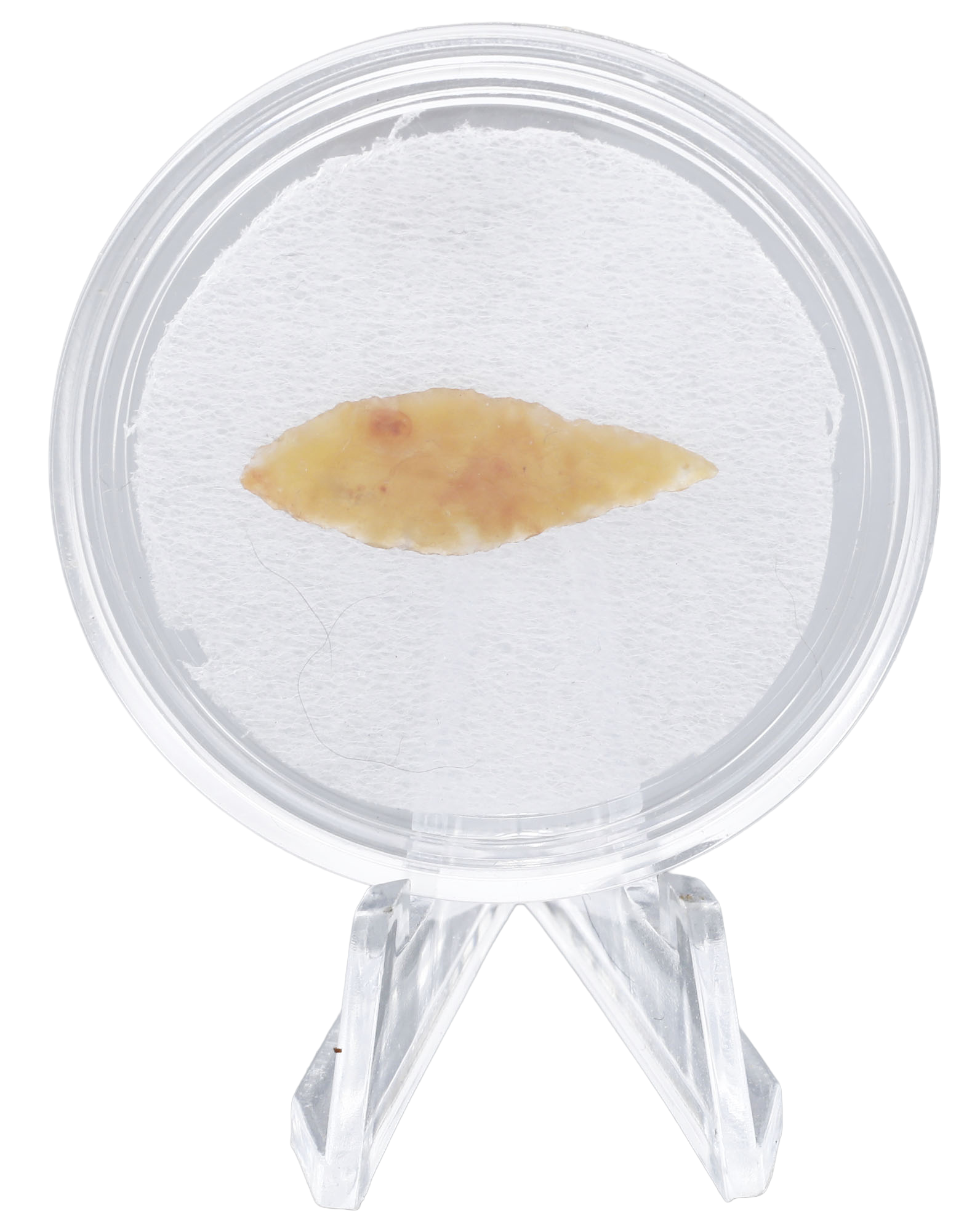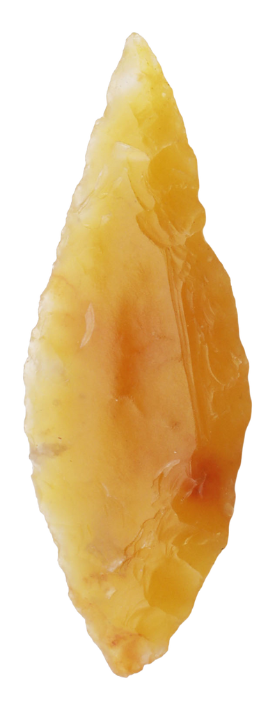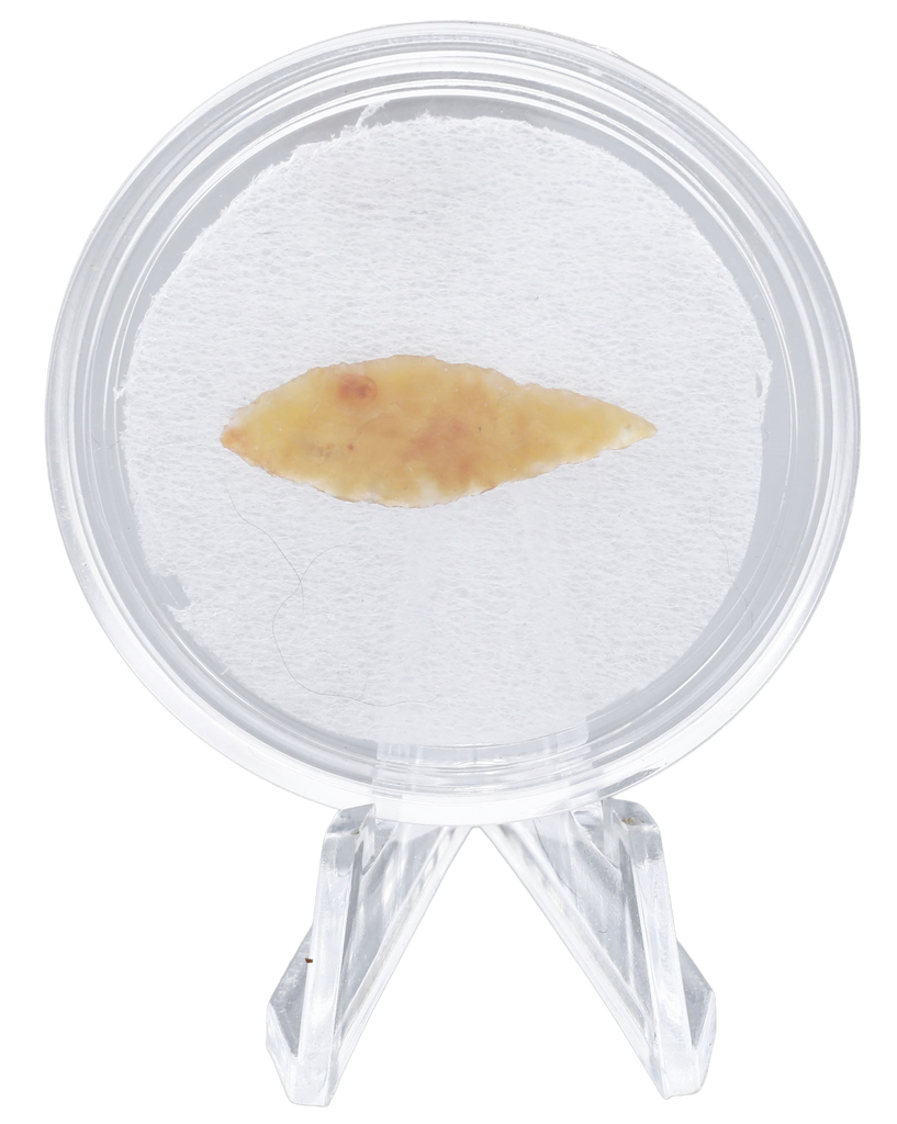 Early Dynastic period. About 1” length, finely flaked flint with both sides finished in the round. Leaf-shaped with fine color. Probably used for hunting small game. In a plexiglas display mount and easel. With a certificate of authenticity.