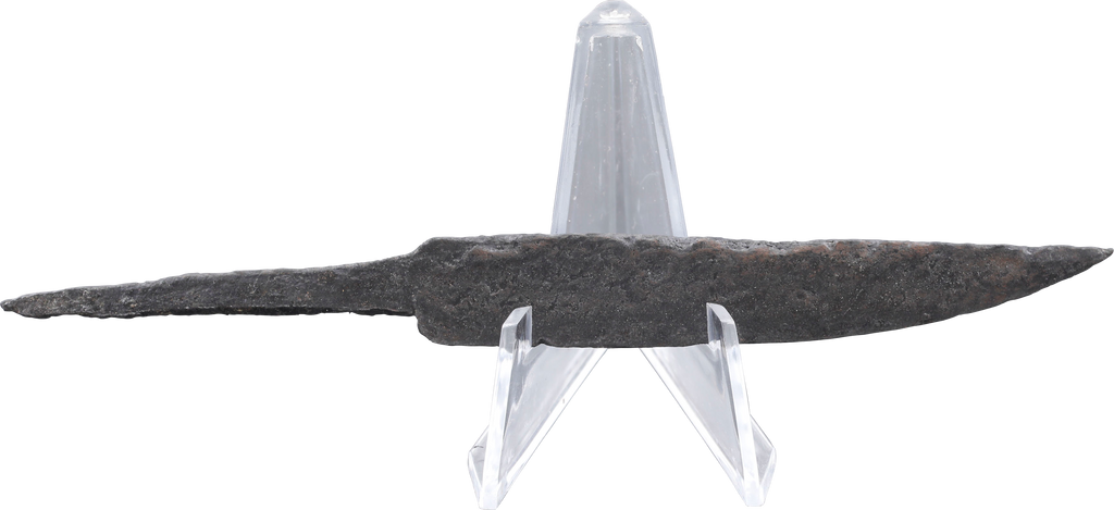 Cambridgeshire, England. About 5 3/4” (5.79”) total length with distinctly dropped point in scramasax form and tapered “whittle tang” which identifies these, as they were used without guards, mounted in a wood or antler grip. (See Leather Working Reverend and Inhabitat for similar examples with original grips). Blade of thin fighting section. A slashing weapon, designed for throat-cutting, these were so esteemed by Vikings that it was these, rather than the larger scramseaxes, that were buried with the warriors. Virtually every old town in Cambridgeshire has a recorded Viking history. Ely Abbey was destroyed in 870 by Danish raiders and Huntingdon was a staging place for Danish raids until 917, to mention two. Excavated and professionally conserved with Plexiglas display mount.