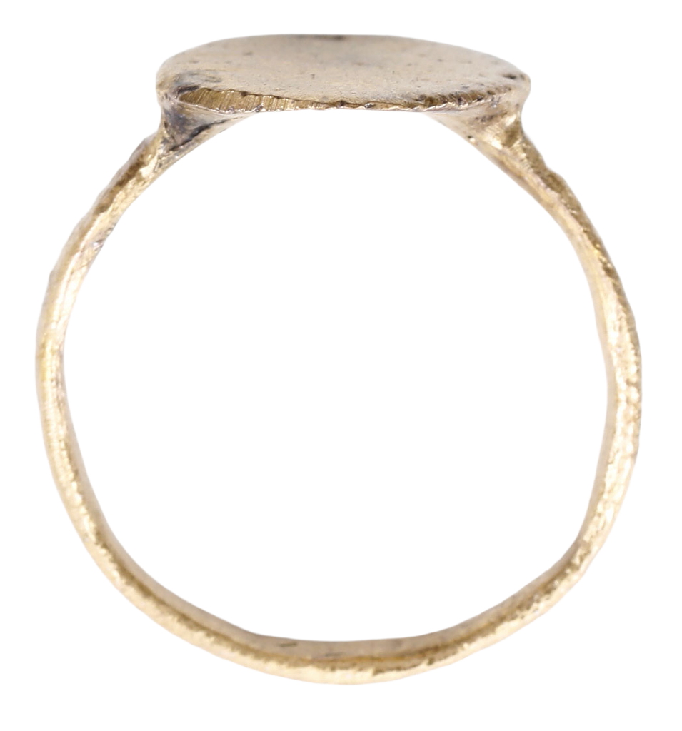 Gilt bronze, large wearable size 10 with 2.5mm rounded face band. Large circular bezel with a barely discernable stipple saltire and figures in the quarters. The designs obscured by degradation or wear. An early Christian ring. Professionally refurbished with the 24karat gold overlay restored. Gift boxed with a certificate of authenticity.