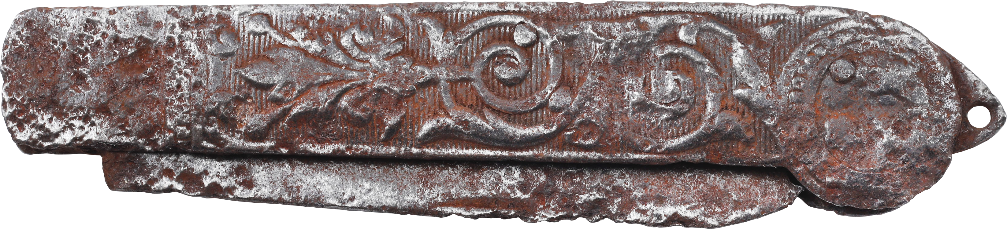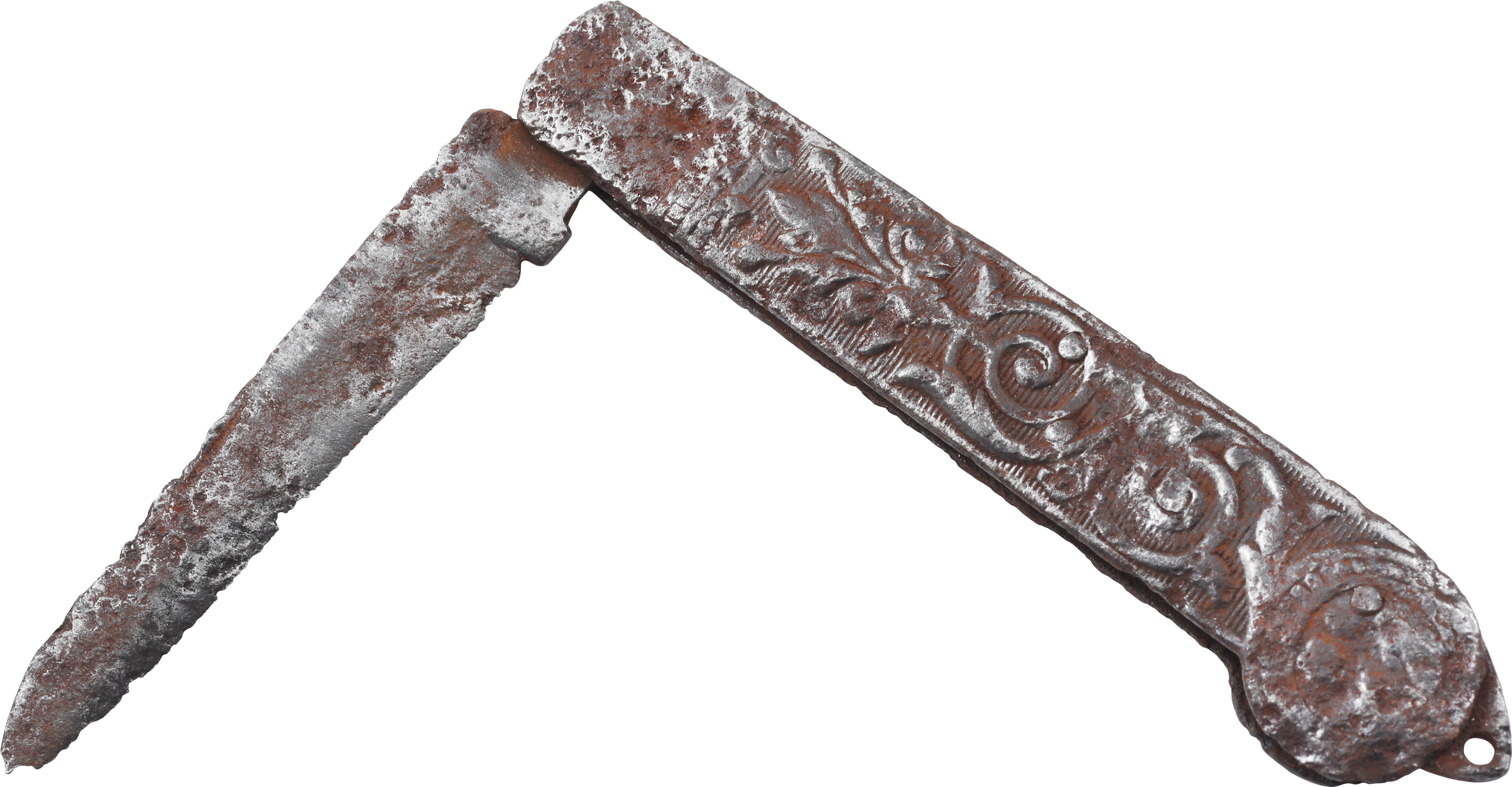 All steel construction with side plated embossed in scrolling foliage. 3” single edged blade, unmarked. Surface rusted but functional with the  blade operating and back spring functional. Purchased at Schindler’s Antiques, King St Charleston about 1980.