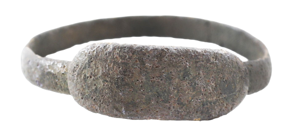 Simple construction and perfunctory quality. Brass (?) size 4 ¾ with 1.9mm rounded face band joined beneath the lozenge shaped bezel with faint monogram (D M D ?).  As found condition. Quite crisp with verdigris/oxidation to the surface.