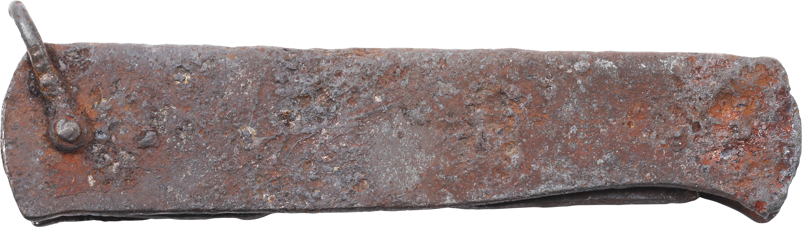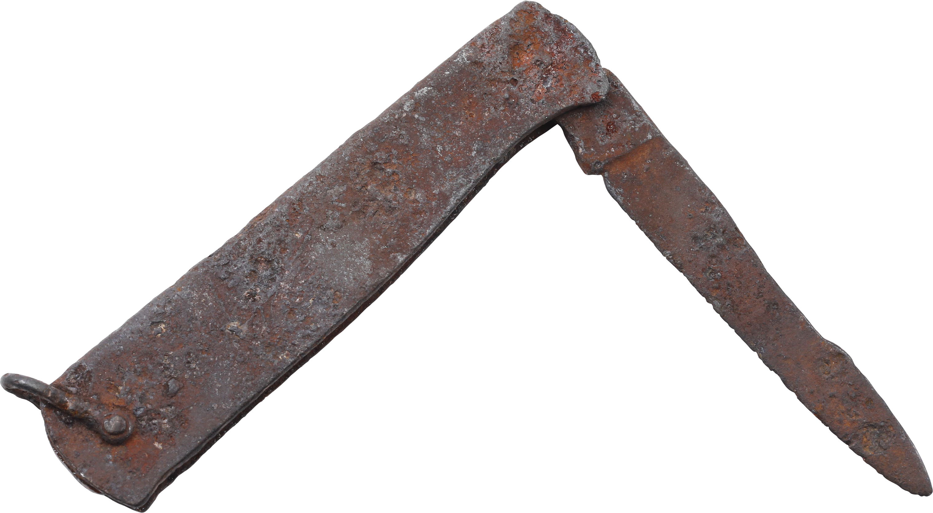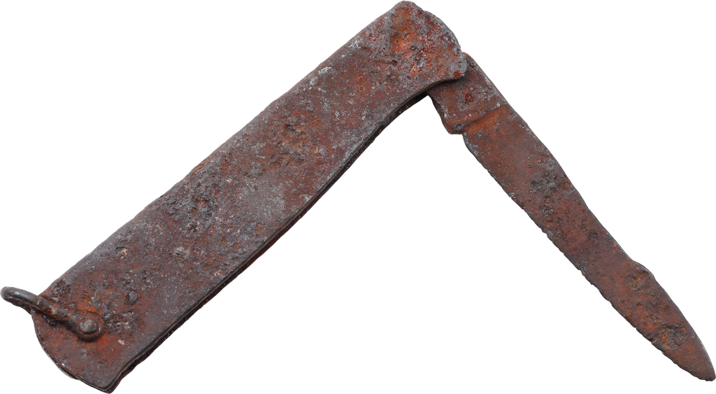 Civil War. Classic example of the cheap knives sold by sutlers to soldiers on both sides. South Carolina find and likely use by a Confederate soldier as a patch knife with a hunting rifle brought to war. 4 ¾” length opened. Made from a folded steel sheet forming the case, enclosing the spring and mounting the folding blade. Its basic construction had the advantage of making it very light when weight mattered. Rusted as shown. Purchased at Schindler’s Antiques, King St Charleston about 1980.