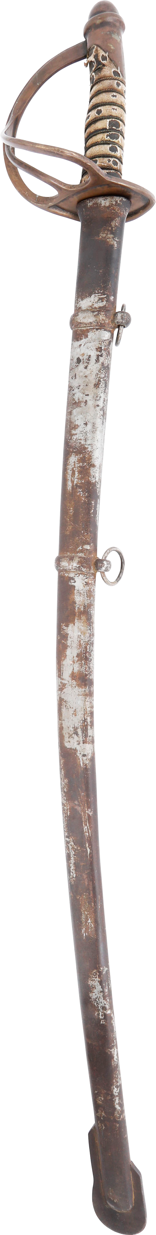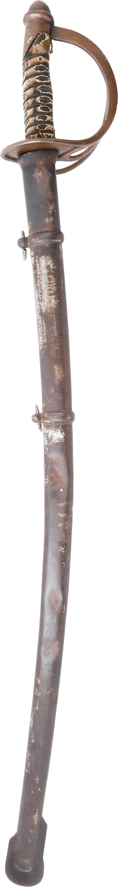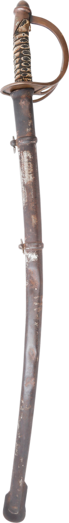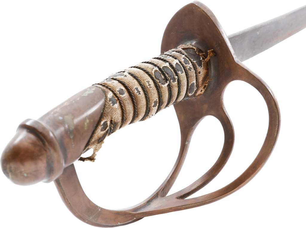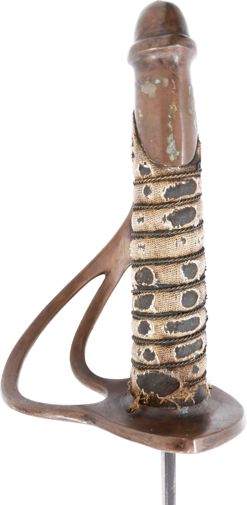 In the decade before the Civil War Centennial, interest in Civil War weapons increased resulting in a premium on Confederate weapons. This resulted in some, yet to be identified, opportunists creating fake Confederate swords. These were not copies as often seen today, but forgeries intended to and which likely did, deceive a purchaser. This example is a cavalry officer’s sword marked WM GLAZE COLUMBIA SC 1864, noted sword producer associated with the Palmetto Armory. It has been “aged” to suggest honest wear and secreting after the disarmament. At the time, there were no comprehensive references and the few books on the subject were line illustrated providing no useful information on which a judgement of authenticity could be made. A curiosity in the history of sword collecting and a substantial stand in for the five figure original.
