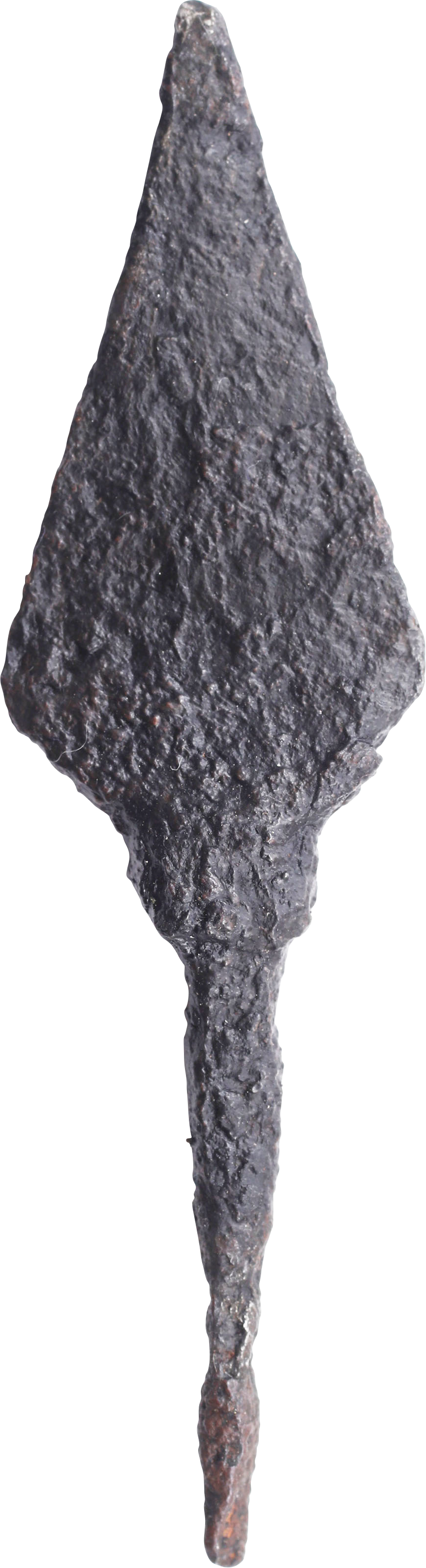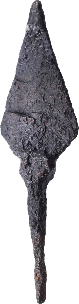 Used by the Saracens defending the Holy Land against the Crusaders. See, Arms and Armour of the Crusading Era, Nicolle # 691. Forged iron of classic form with thick flat kite shaped point with flared shoulder on tapered tang. A flesh cutting arrow capable of penetrating the leather and textile armor of the Crusaders. 2 1/2” (2.57”) total length. Recovered from the Levant Battlefields. Professionally conserved excavated condition.