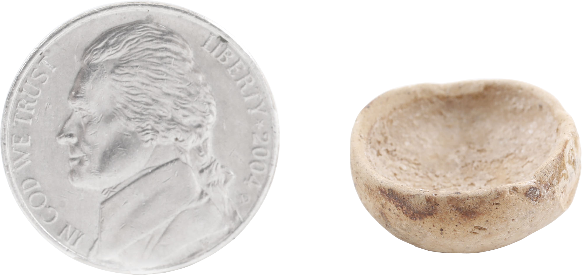 Miniature size, shown with an American nickel for scale.  Interred with the deceased for service in the afterlife. Round footless bowl as used with dirt floors. Wheel turned. 17.7mm, 0.69” diameter.