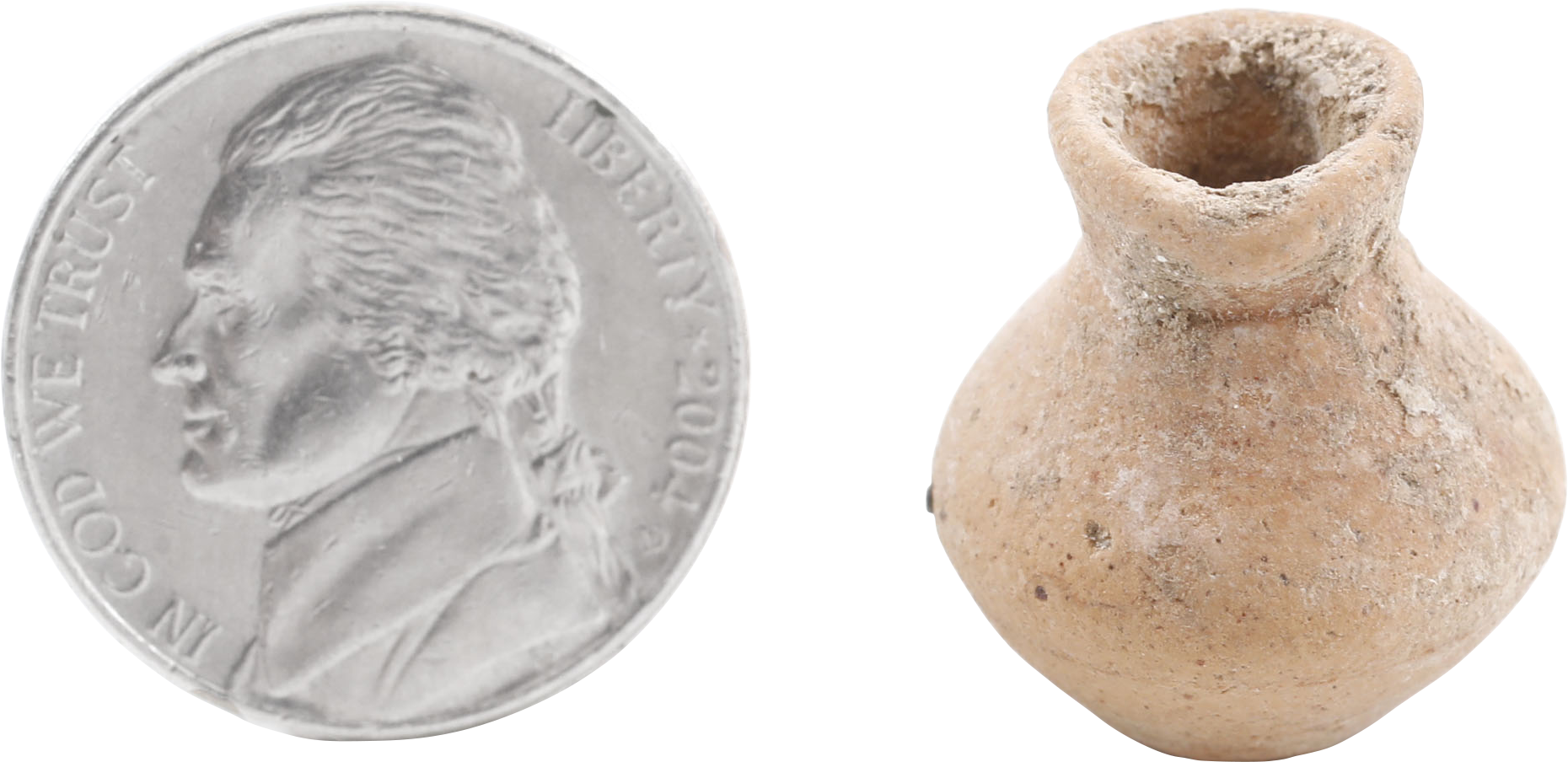 Miniature size, shown with an American nickel for scale.  Interred with the deceased for service in the afterlife. Angular jug with flat base and broad flared spout, showing Greek influence. Wheel turned with the body hollowed. 19.3mm, 0.76” height.