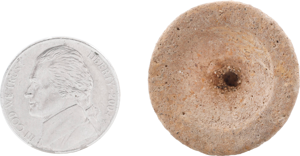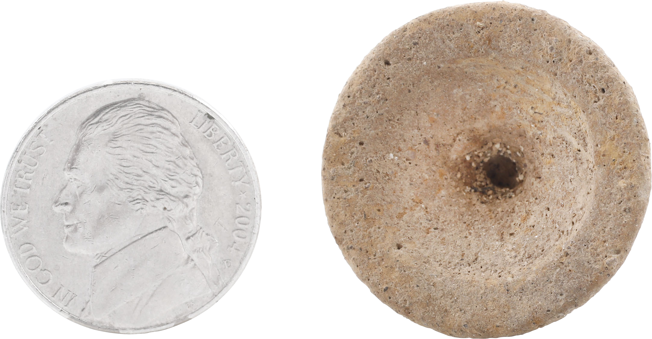 Miniature size, shown with an American nickel for scale. Interred with the deceased for service in the afterlife. Flat top bowl with thick slightly flared foot showing Greek influence. Wheel turned. 27.6mm, 1.08” diameter.