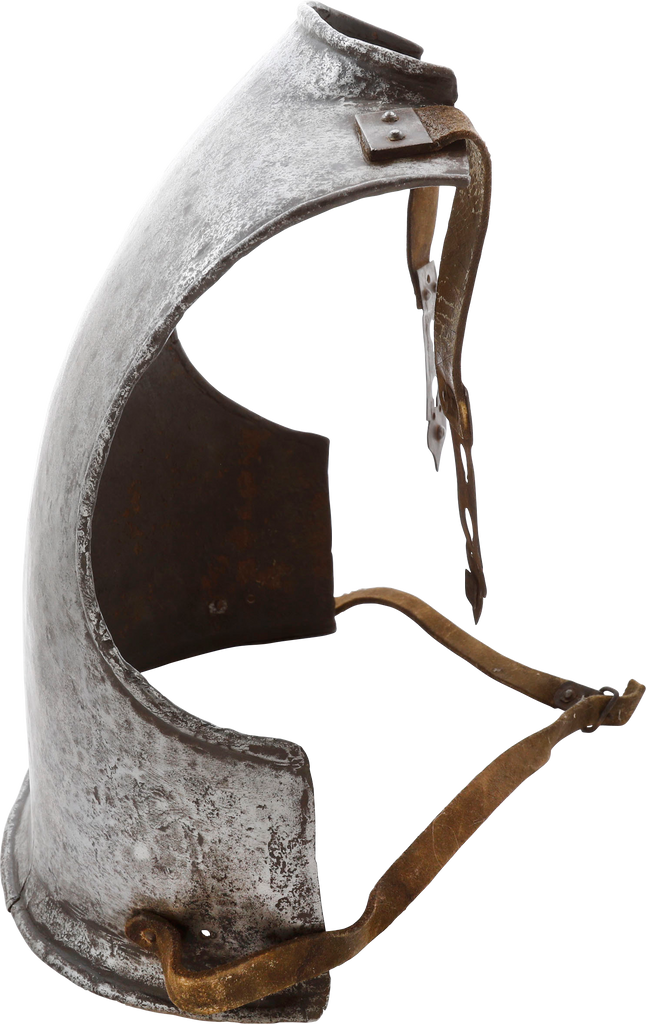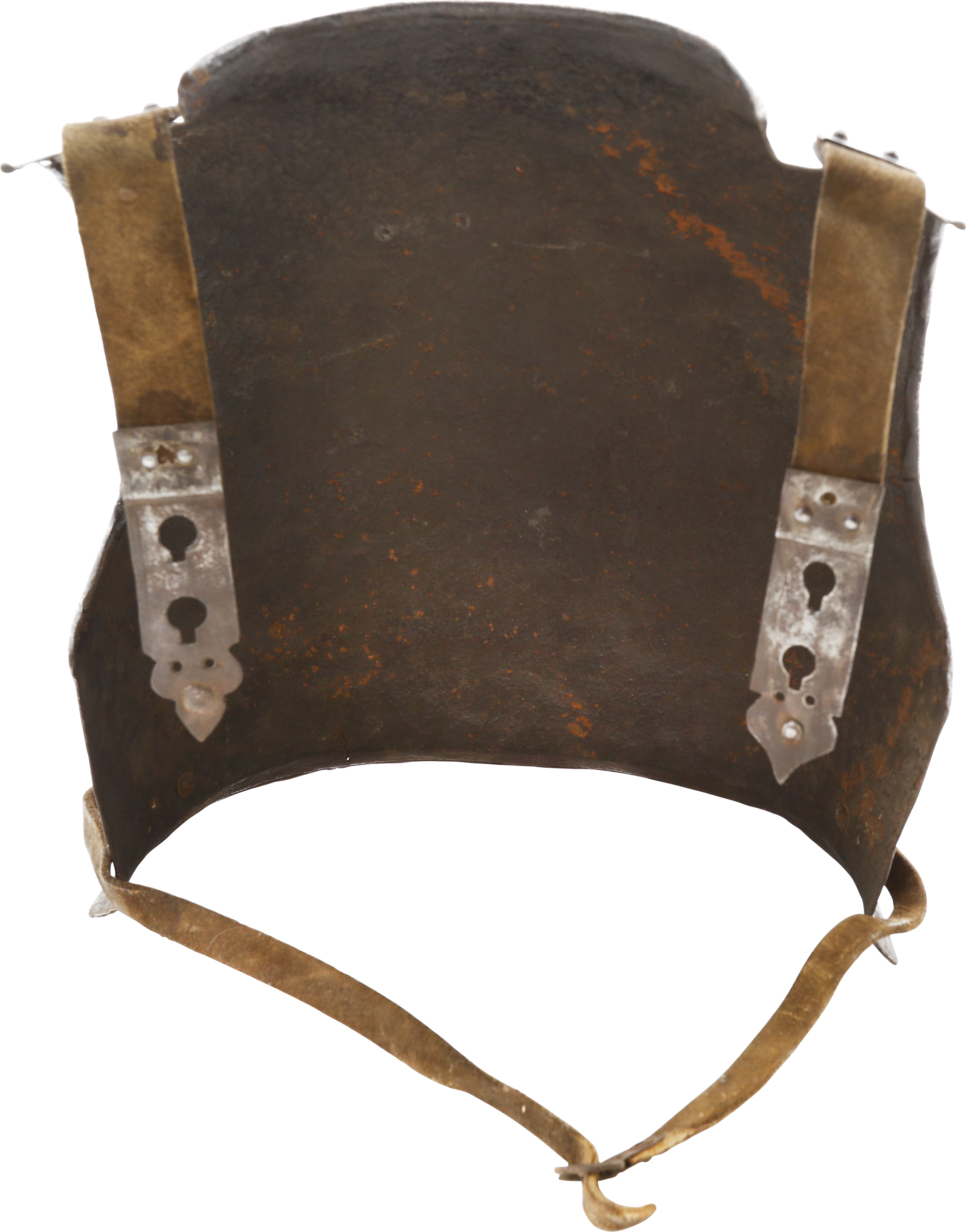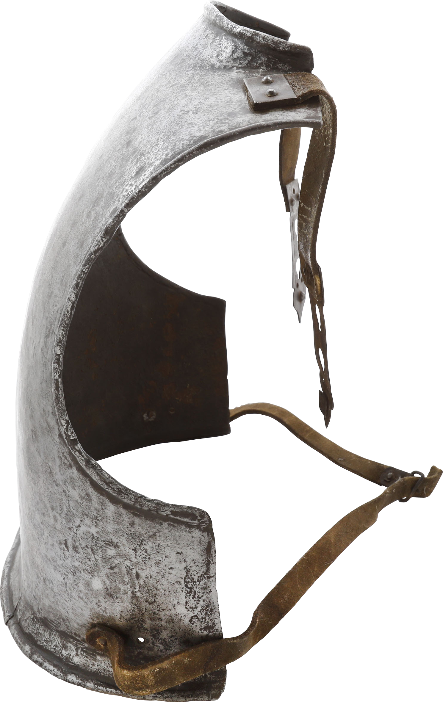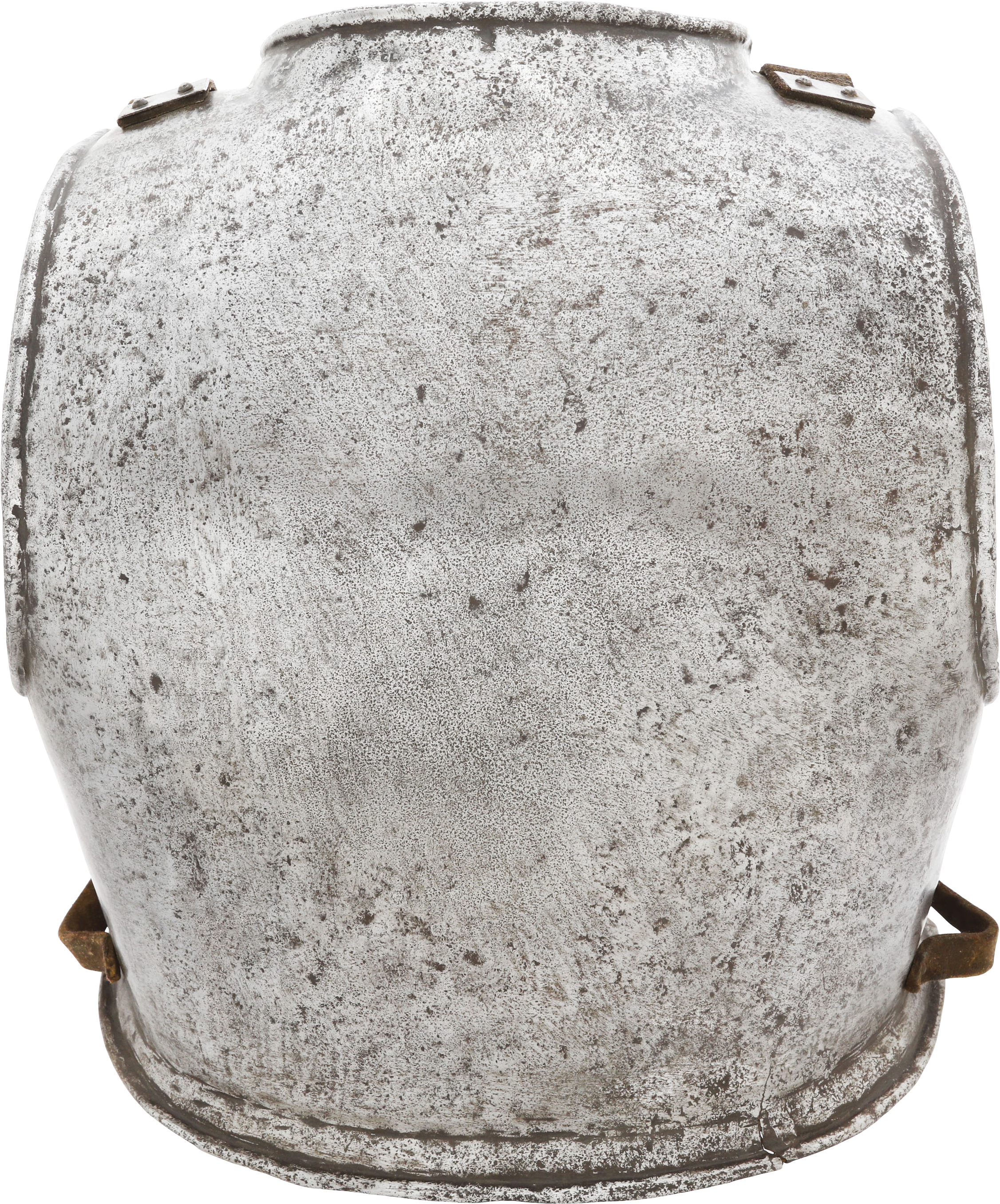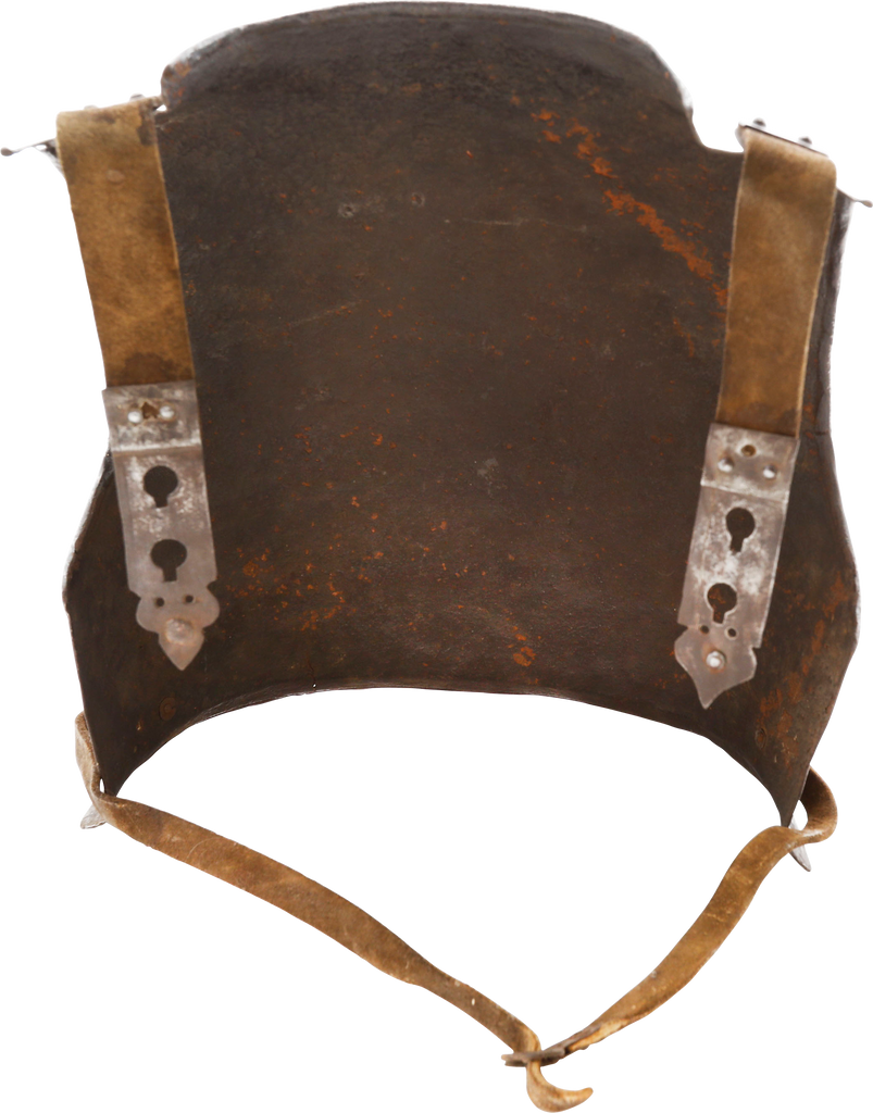 15 ¼” height of anatomical form with rolled edges to the neck and arms. The base with rolled edge flare. The top struck with the crowned mark of James II. See The London Armories of the 17th Century, Richardson, p.19. To the left is the CL maker’s mark of Charles LeMoth, Richardson, op. cit. p.57. Well preserved with the shoulder and waist straps complete and sound.