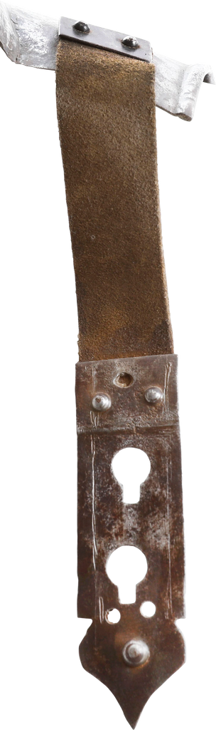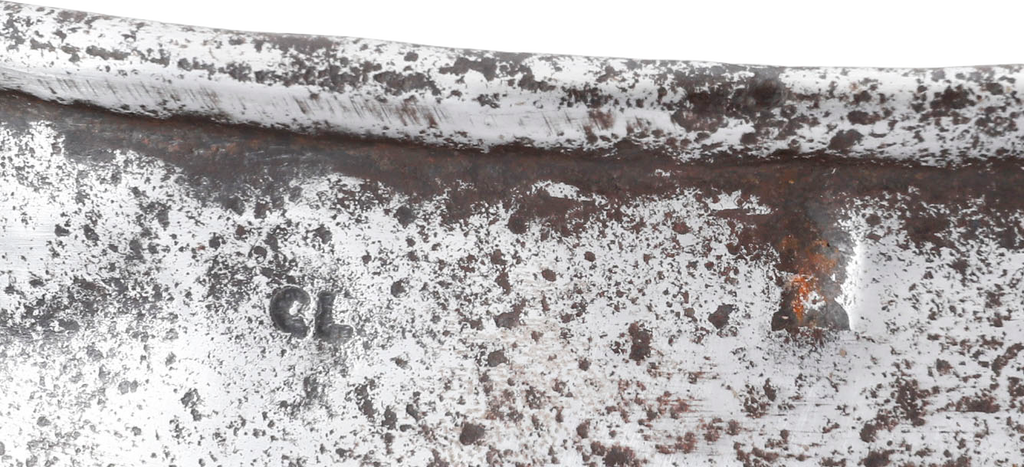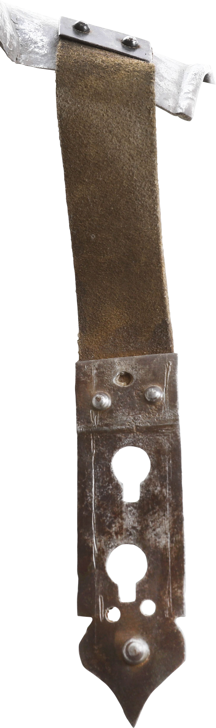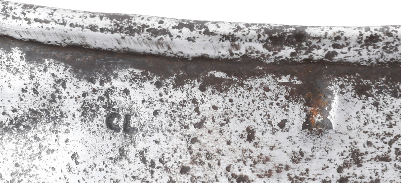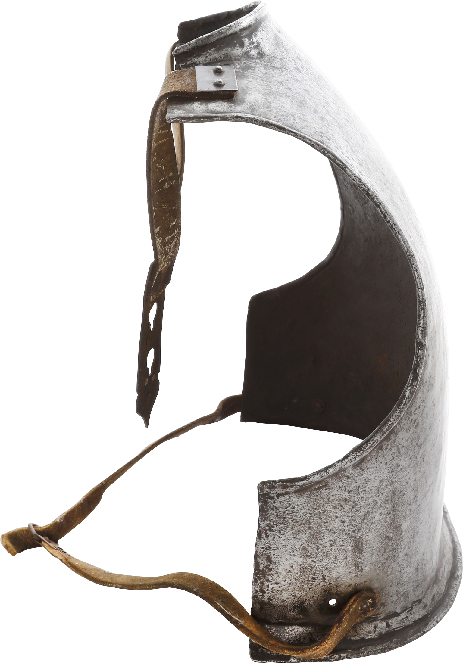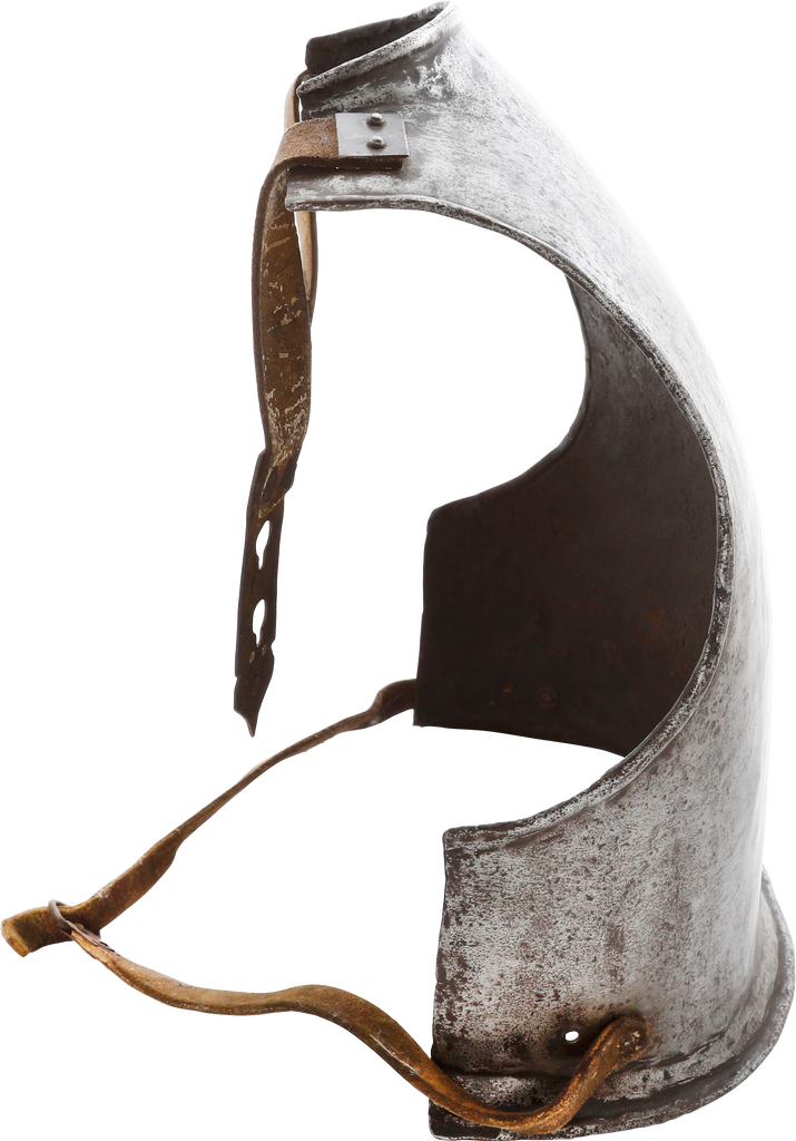 15 ¼” height of anatomical form with rolled edges to the neck and arms. The base with rolled edge flare. The top struck with the crowned mark of James II. See The London Armories of the 17th Century, Richardson, p.19. To the left is the CL maker’s mark of Charles LeMoth, Richardson, op. cit. p.57. Well preserved with the shoulder and waist straps complete and sound.