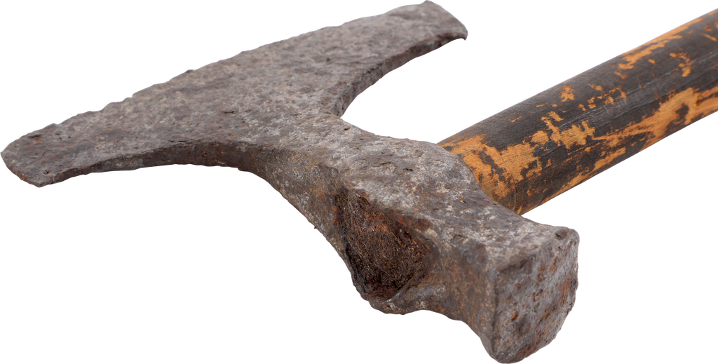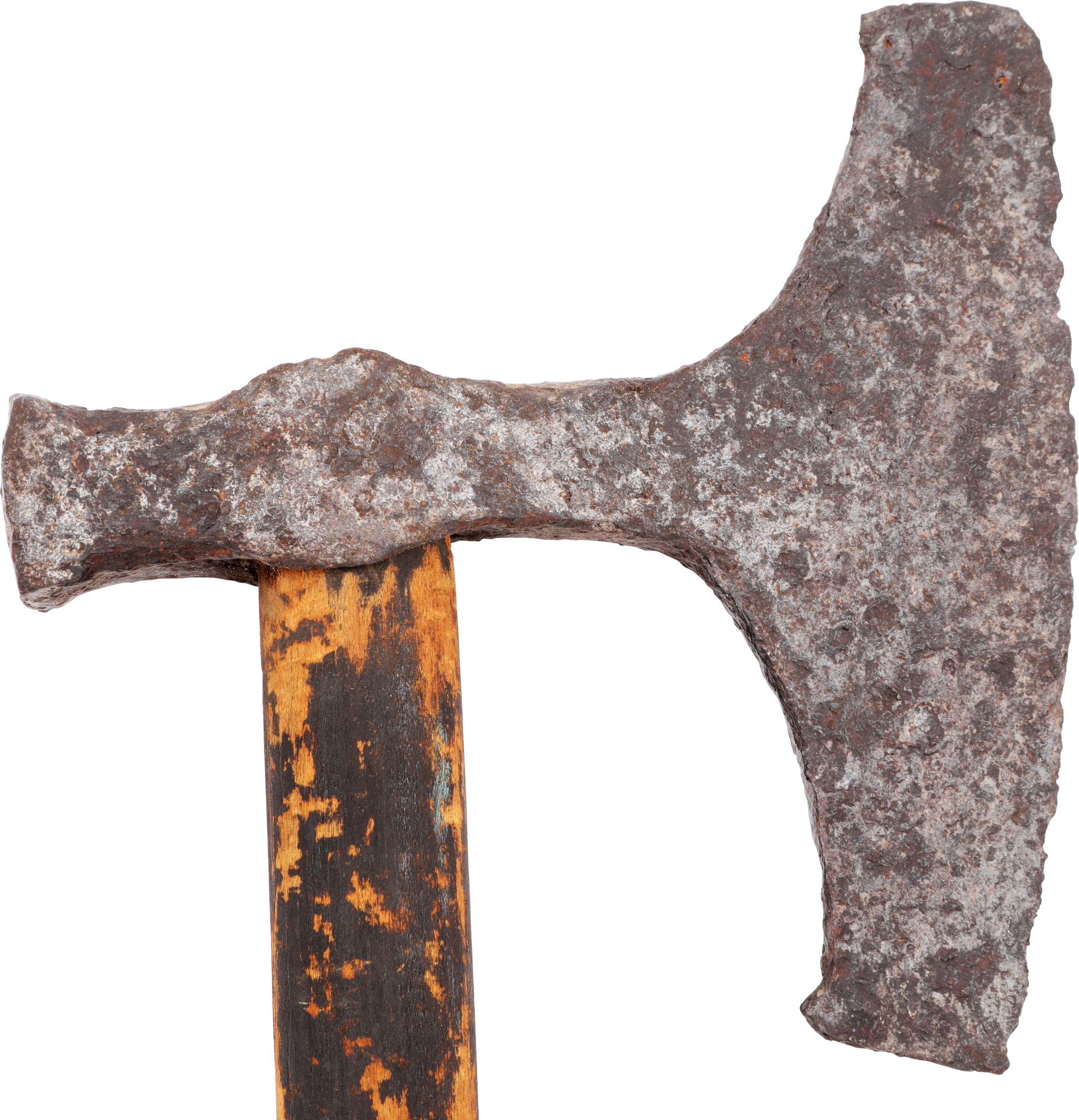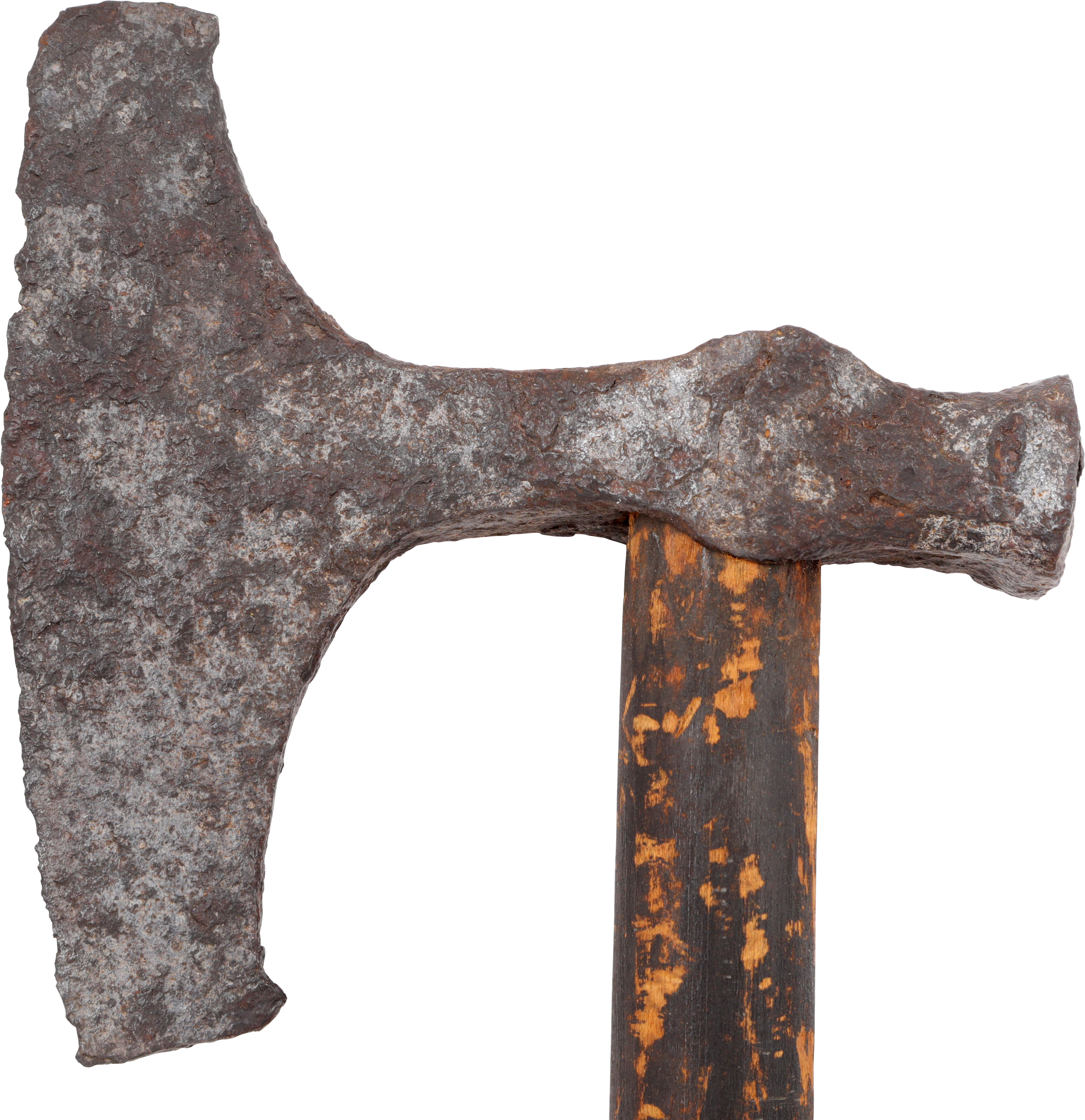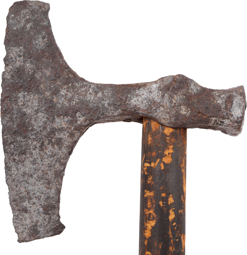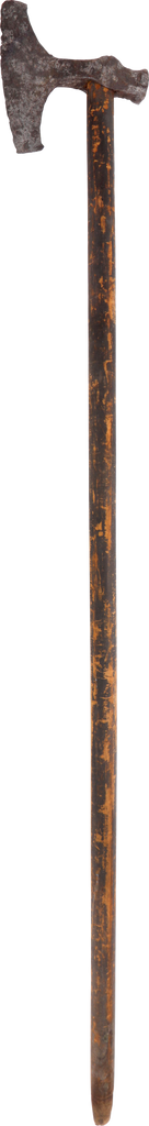 Iron head with curved edge bit. The top ends with small points for catching an opponent’s blade. Flared edge oval eye and hammer back. Wood haft with dry slightly flaking surface. The butt shaped for a metal cone tip, long lost and the wood aged consistent with the rest of the haft.  While of great age, the haft is likely not as old as the head. A recent episode of National Geographic’s "Vikings: Rise and Fall" showed a Viking warrior carrying an axe nearly identical to this. Overall length is 47 3/4".