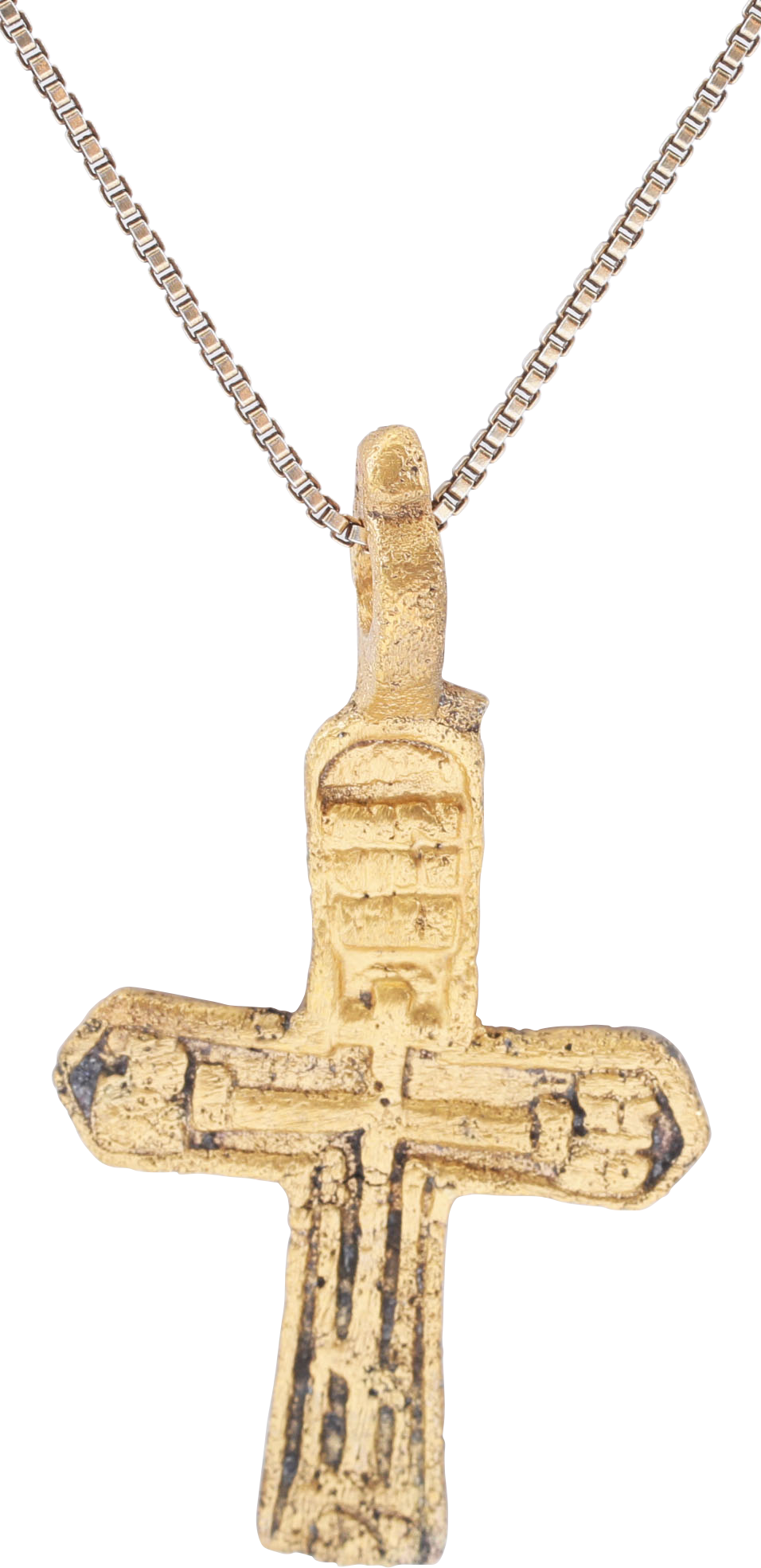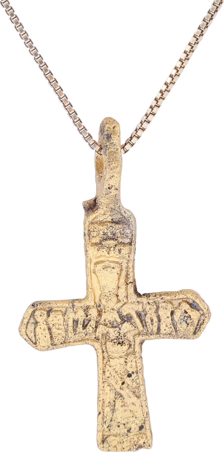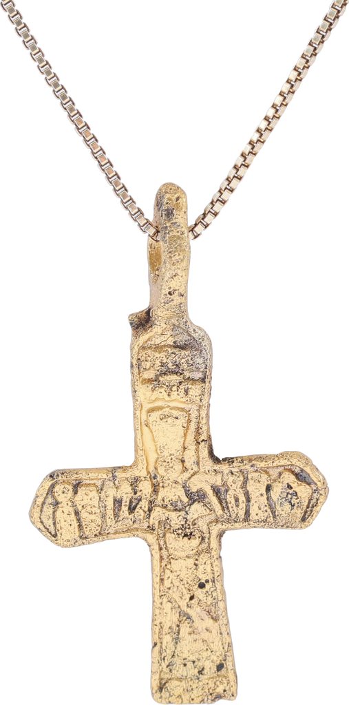 Orthodox rite, Ukrainian or Russian. Gilt bronze, just over 1 3/8” (1.42”) height. Delicate beams, the front with an incised cross and Cyrillic ciphers at the beam terminals. The reverse with 5 vignettes surrounding an inscription at the junction. Surface worn and textured from burial. Professionally refurbished with the 24karat surface restored, mounted on an 18” gilt Sterling silver neck chain for modern wear. Gift boxed with certificate of authenticity.