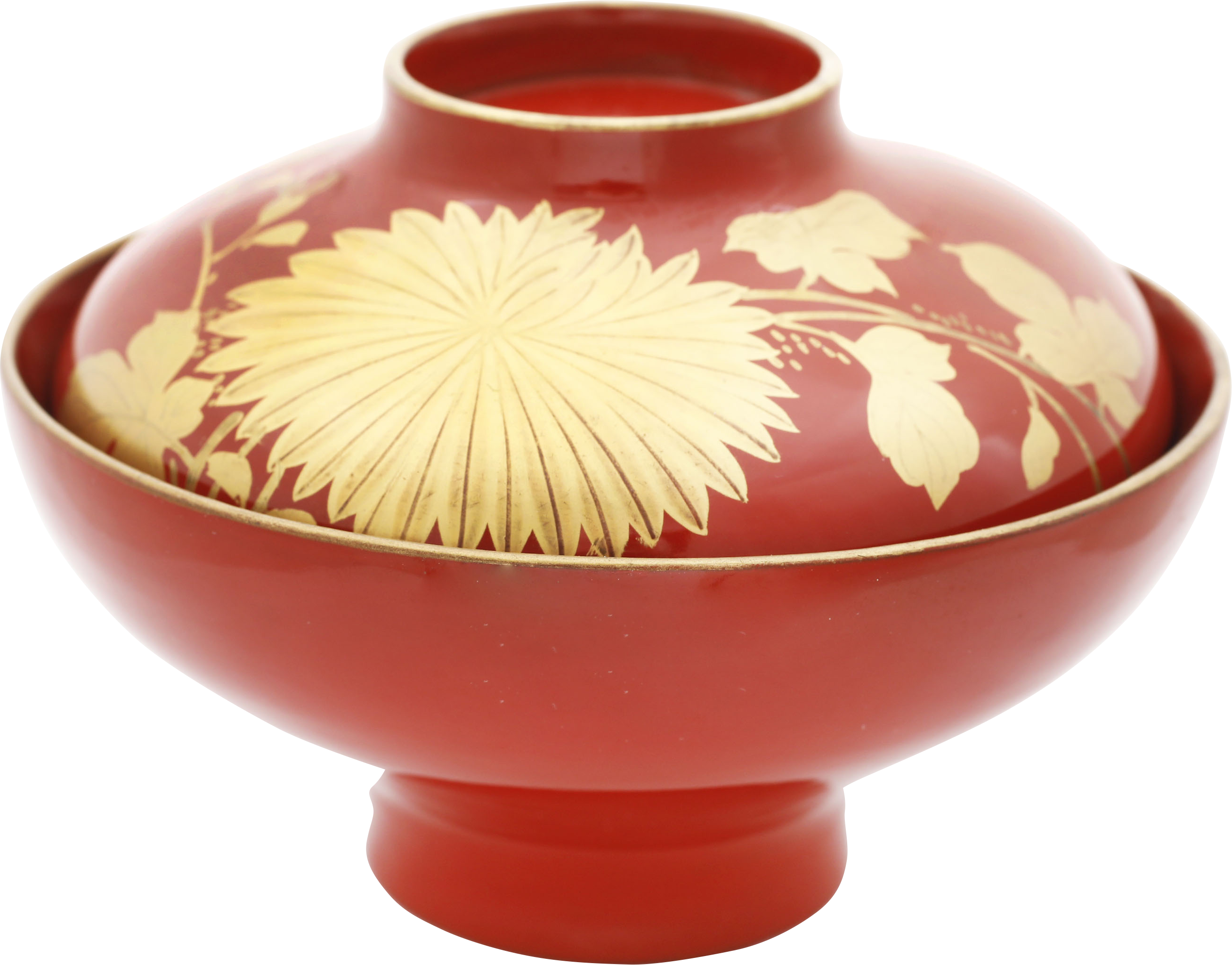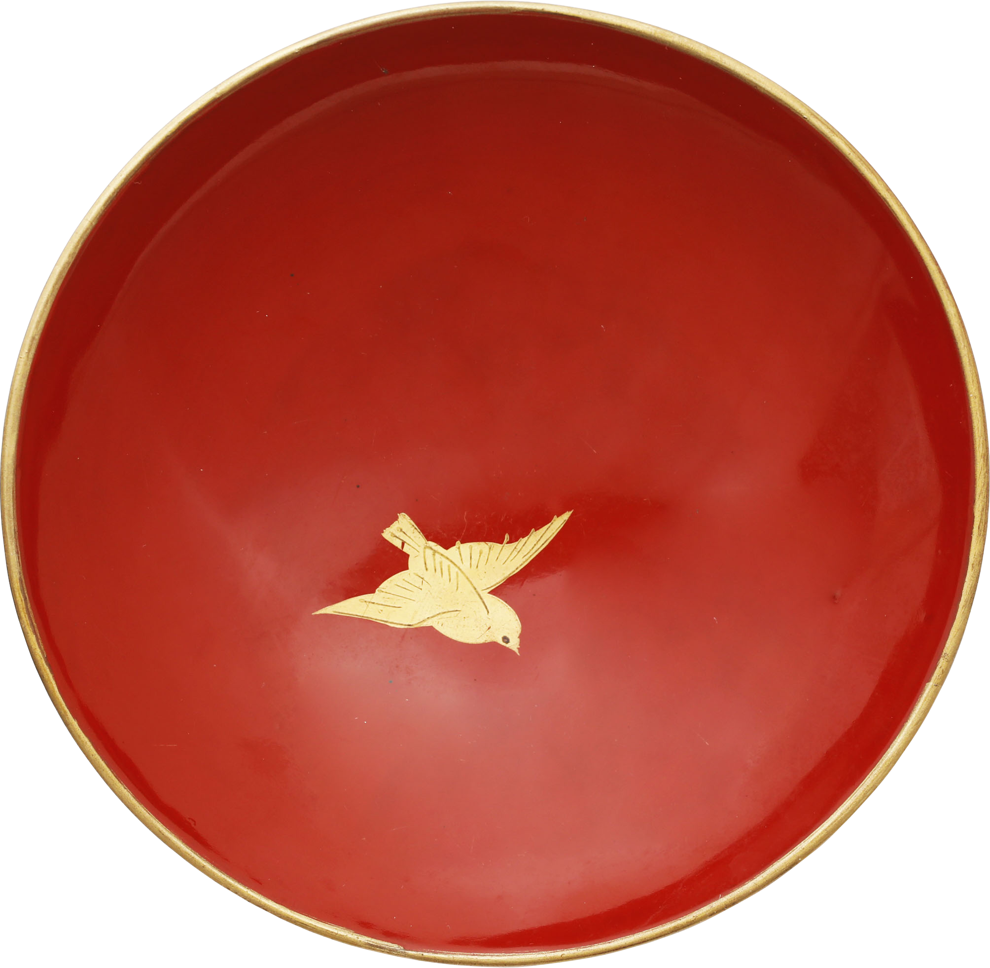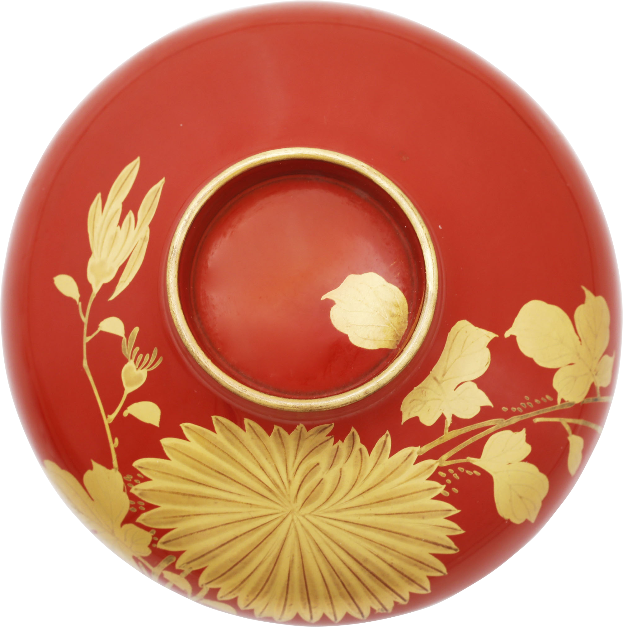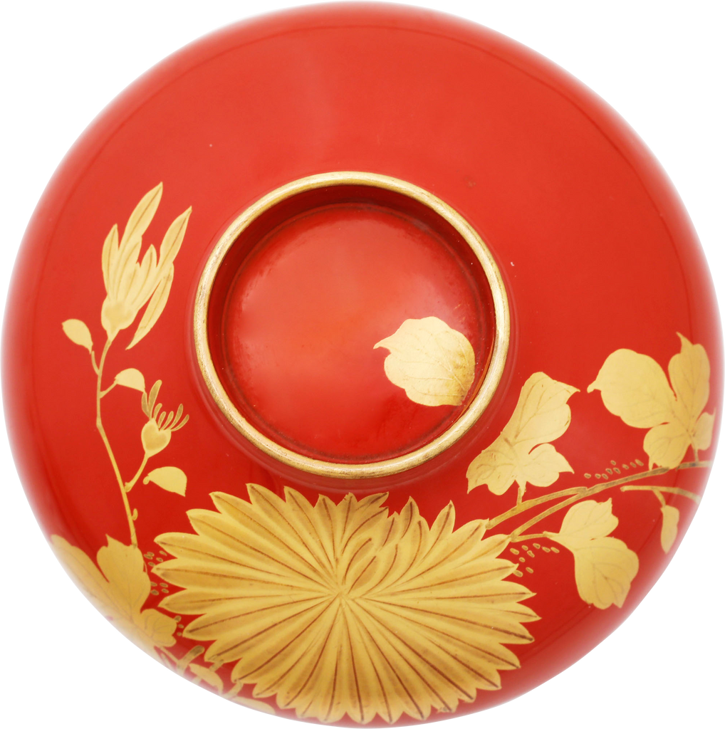 Late 19th century. 4 3/4" diameter. Red with lovely gold (true gold dust pigment) chrysanthemum and its foliage. The inside of the lid with a bird (chiordi) in flight. Excellent.